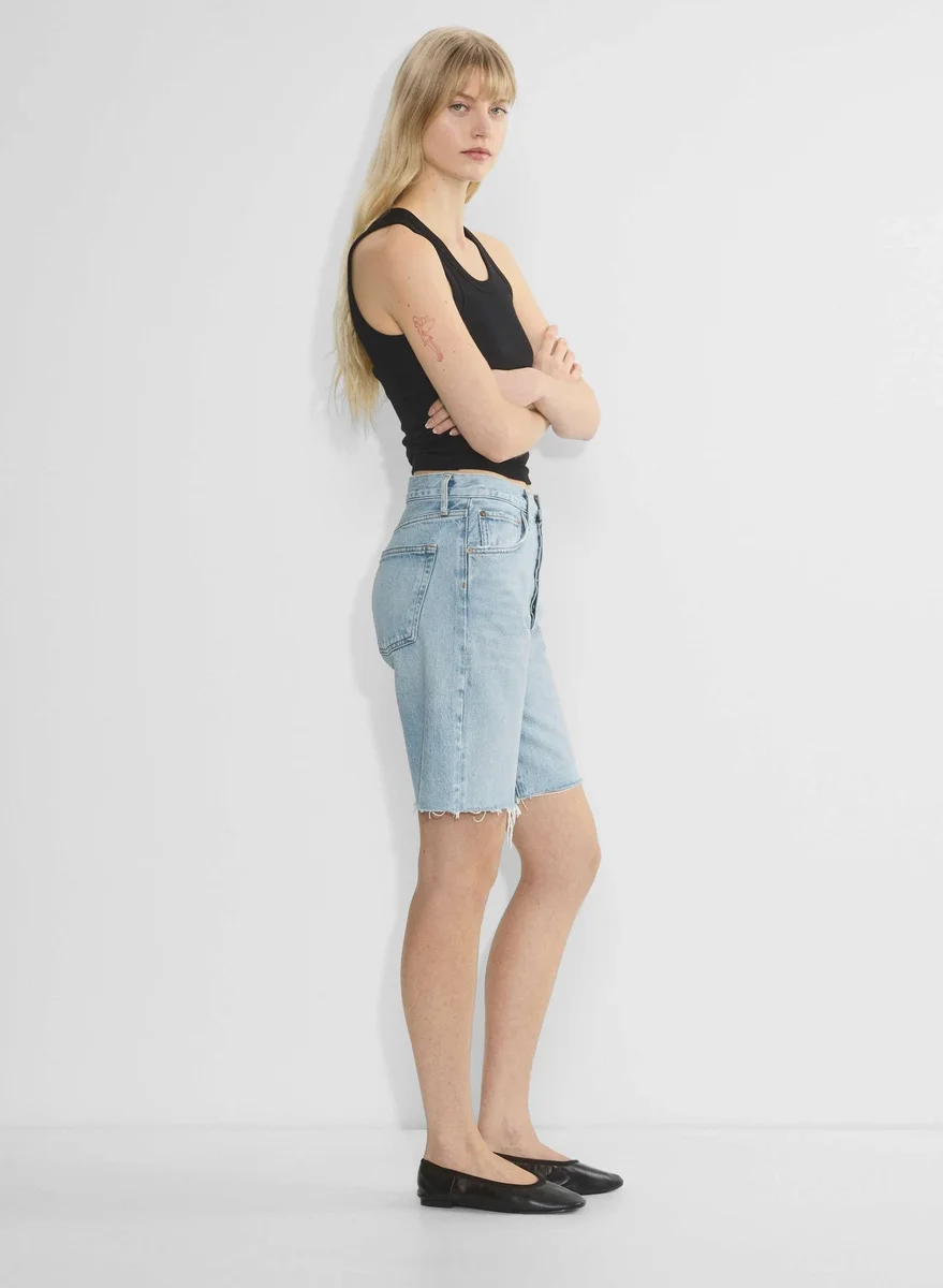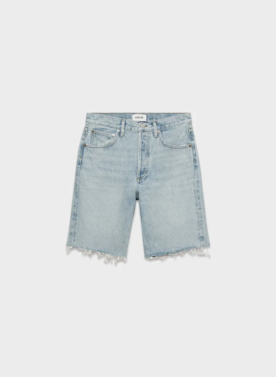 The ’90s called, they like your shortsThese are high-rise shorts that sit relaxed at the waist with a straight leg and extended inseam that hits right above the knee. They’re cut from non-stretch 100% regenerative cotton denim with a soft hand feel. This version comes in a marbled light indigo and has a raw hem.