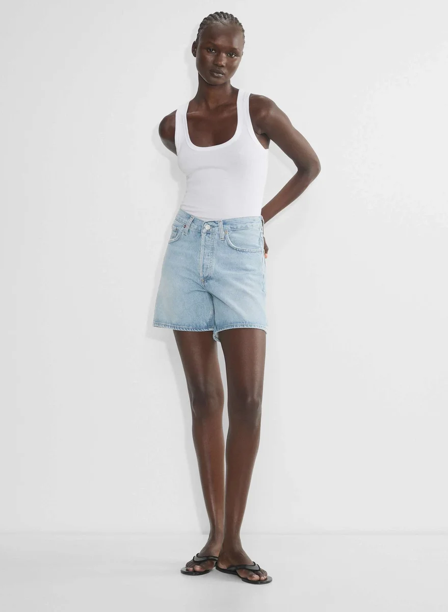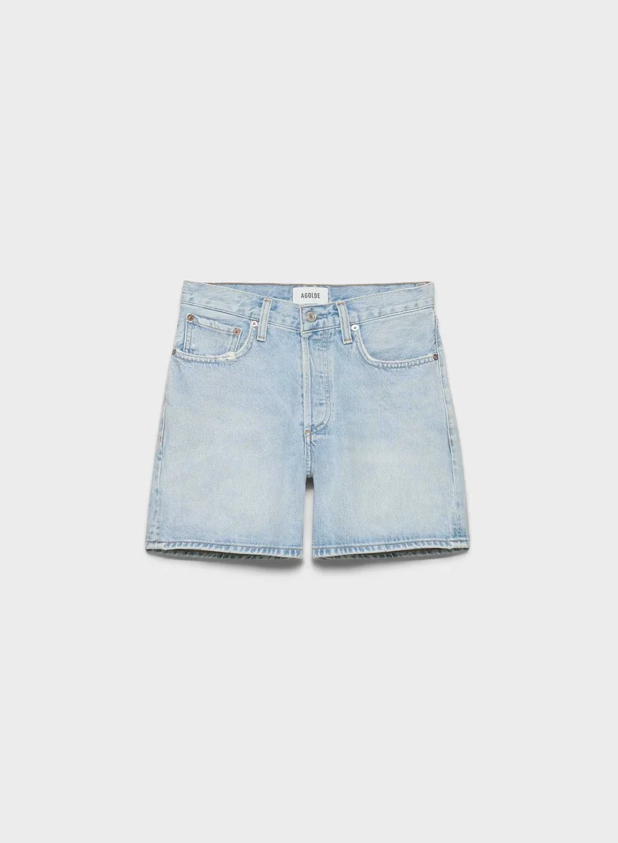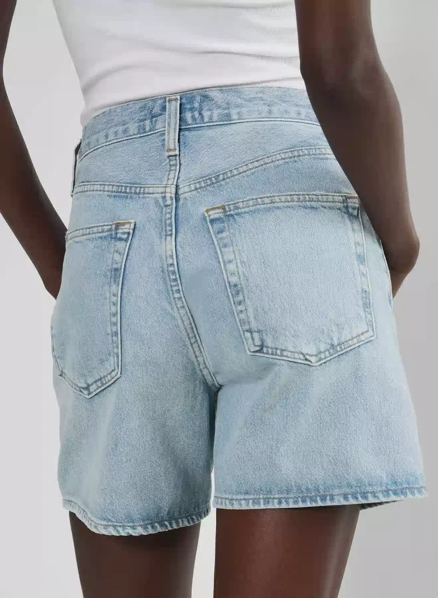 These are mid-rise jean shorts with a relaxed fit and sharp V waist. They’re cut from non-stretch regenerative cotton denim with a soft hand feel. This version comes in a light indigo wash with a clean hem.