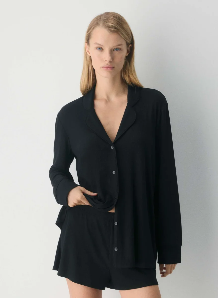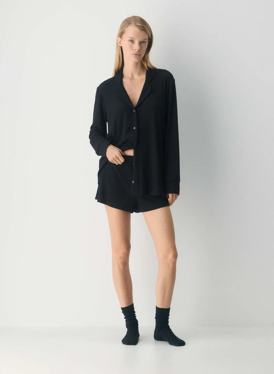 These are mid-rise pajama shorts with an elastic waistband. They’re made from drapey ribbed fabric with a super-soft and cozy feel. The pinnacle of comfort.