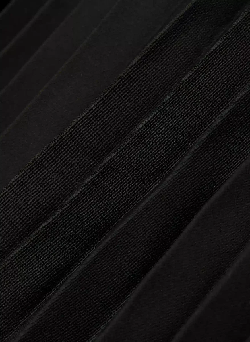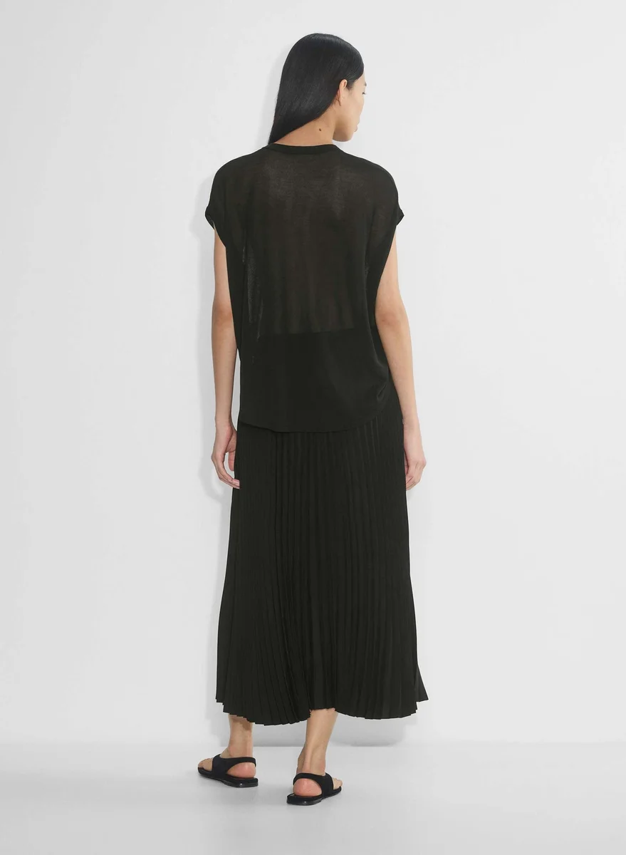 It’s got levels to itThis is a pleated maxi skirt with an elastic waist. It’s made with Studio Drape — drapey matte satin with a smooth look and lightweight feel. This fabric is made with 50% recycled materials.