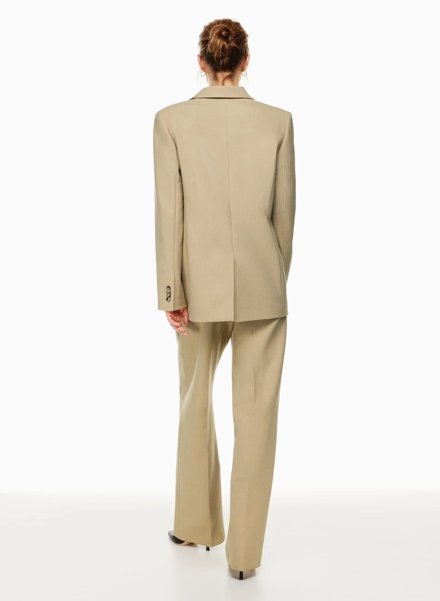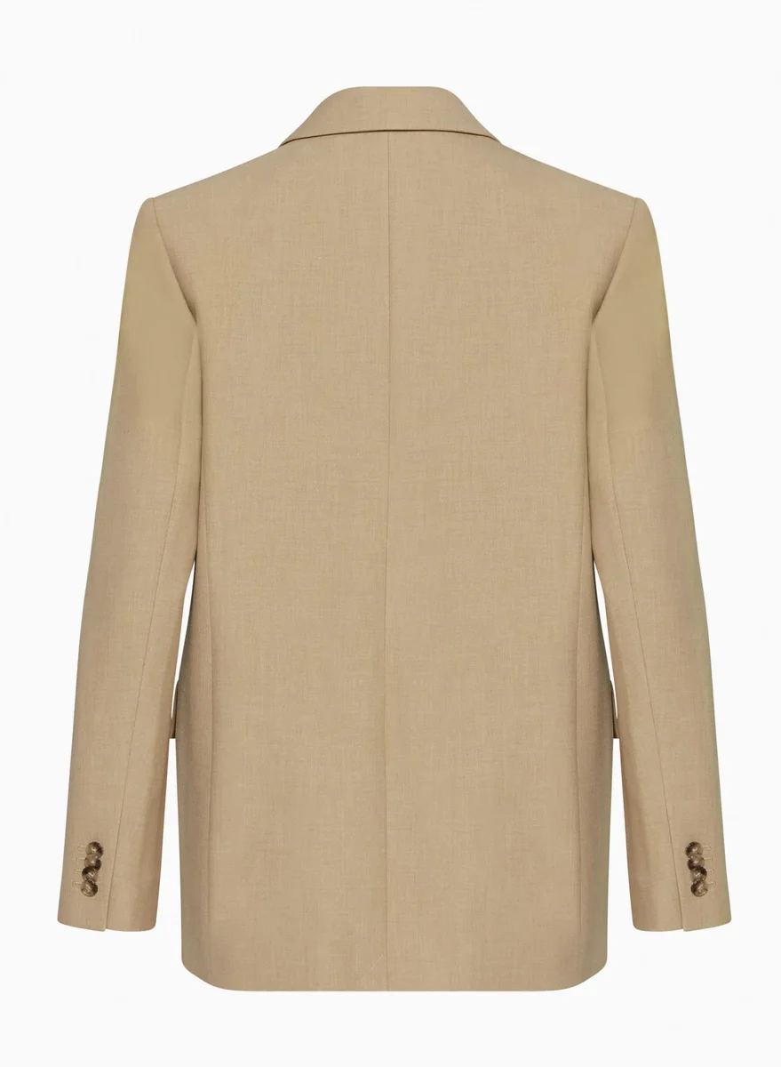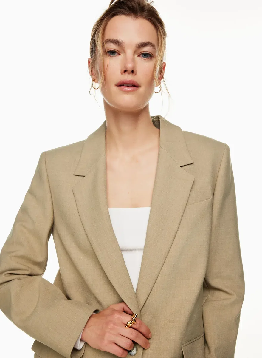 This is a single-breasted blazer with a peaked lapel, double welt hand pockets and shoulder pads. It’s tailored with (Re)ssential — softly structured stretch fabric that holds its form while you move easy. It’s sourced from a premier Portuguese mill and made with recycled materials and LENZING™ ECOVERO™ Viscose — responsibly sourced, wood-based fibres produced through a process that reduces impact on forests, biodiversity and water supply.