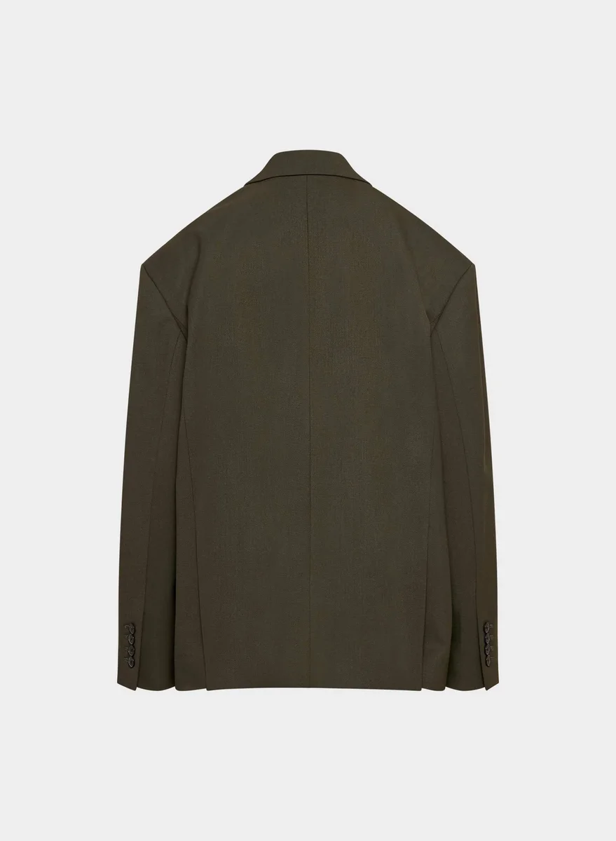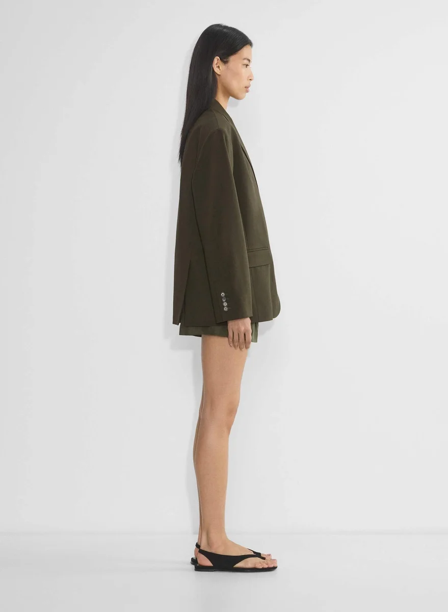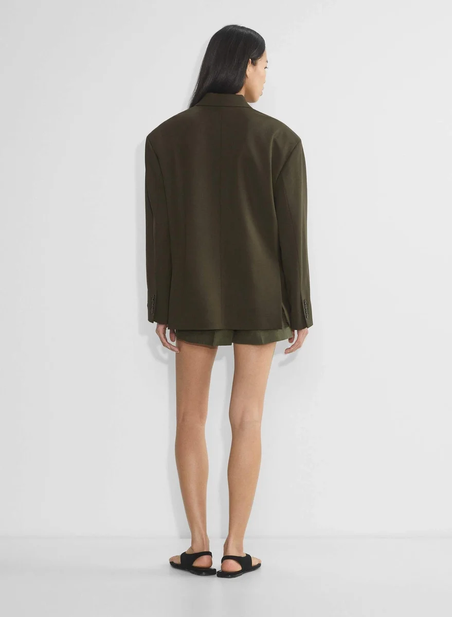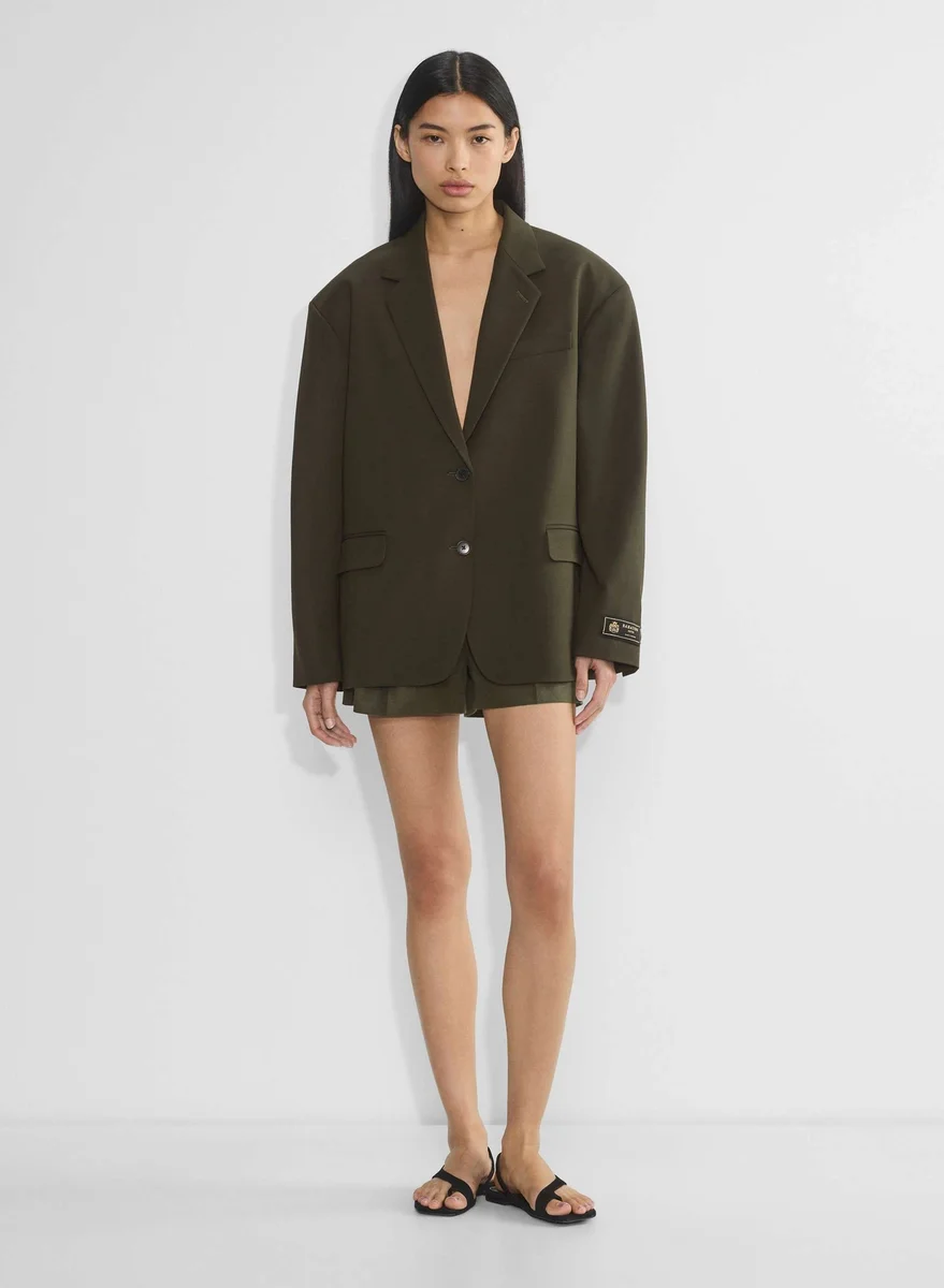 This is an oversized single-breasted blazer with a notched lapel, welt hand pockets and shoulder pads. It’s expertly tailored with City Wool — softly structured stretch wool twill for all-season, all-city wearability. This fabric is sourced from a premier Italian mill.