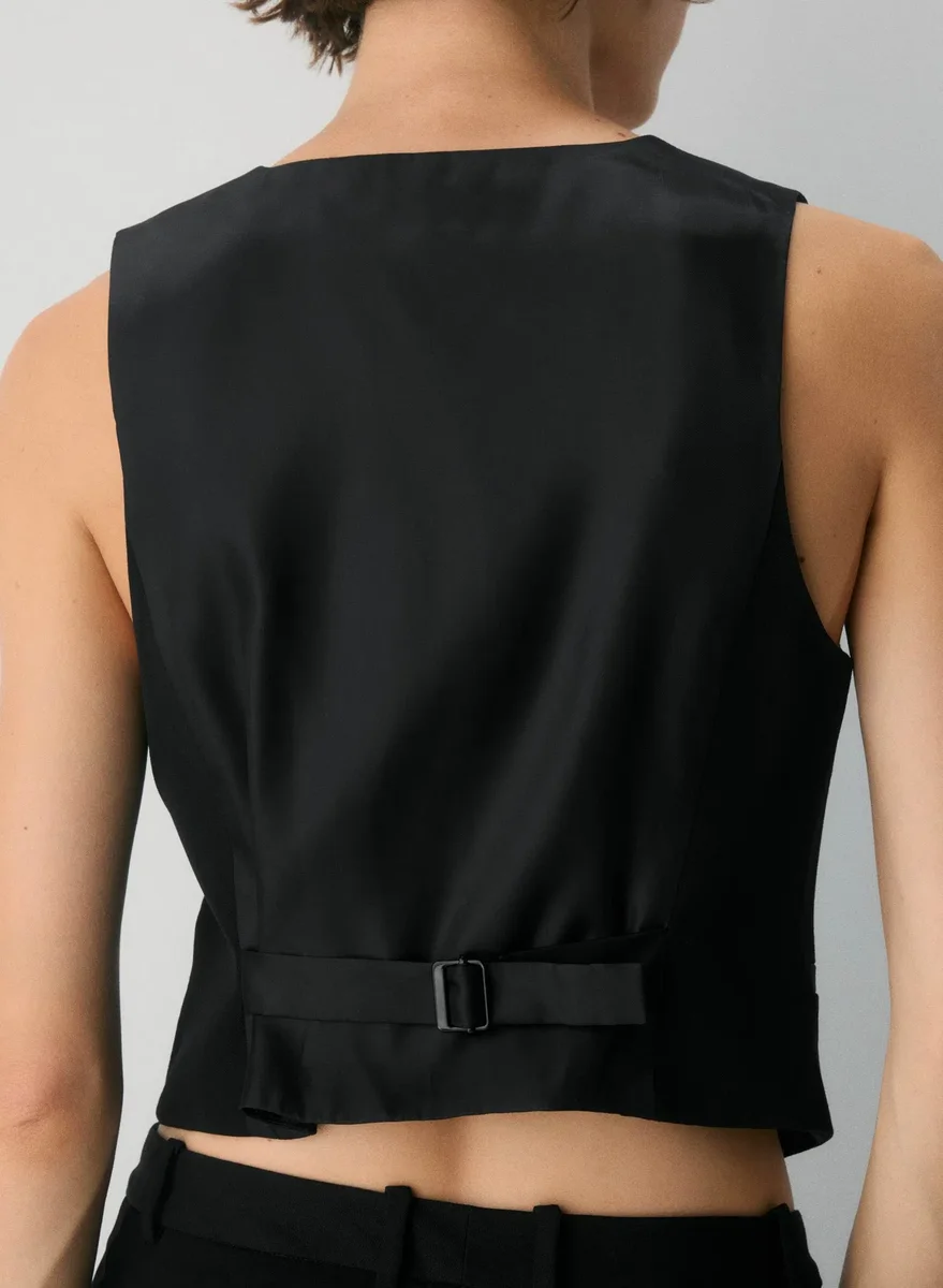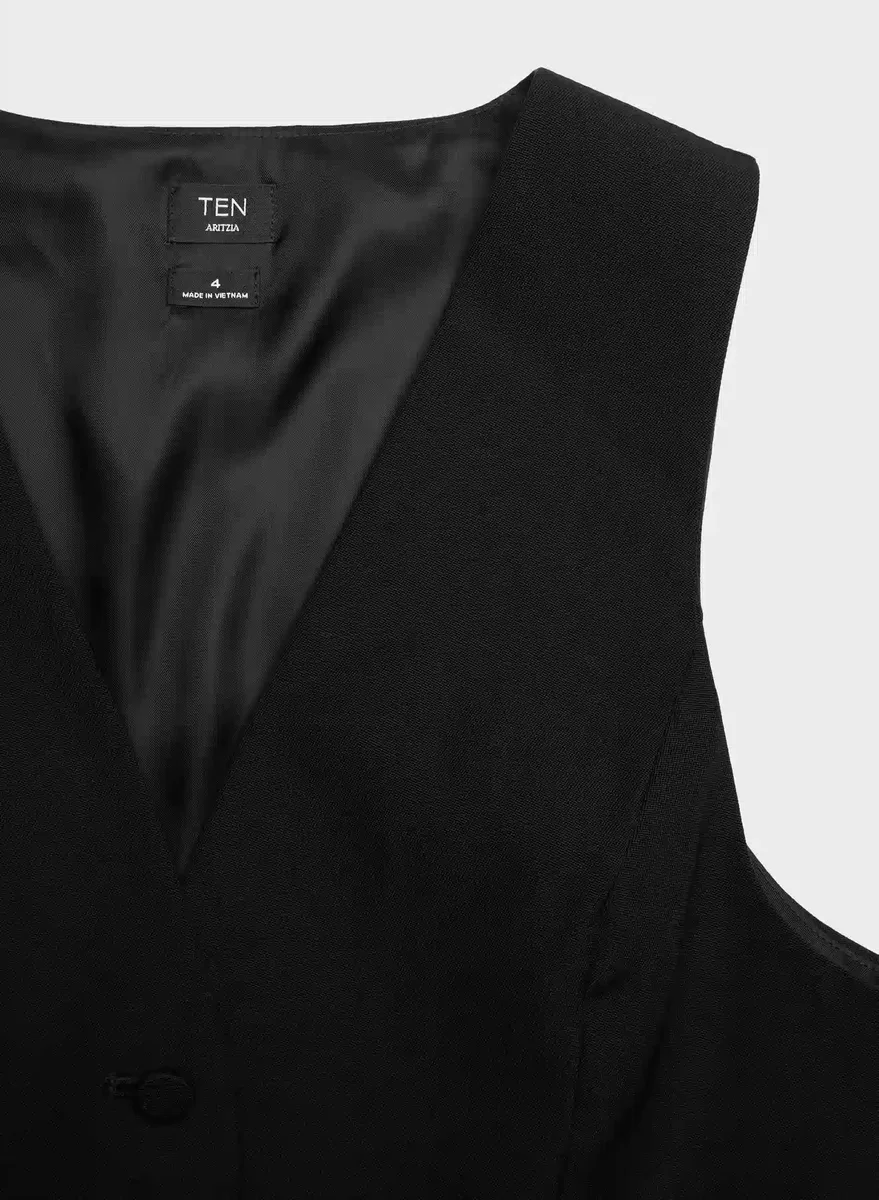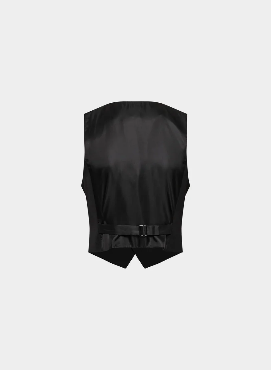 This is a V-neck vest with an adjustable back waist, slim fit and princess seams for shaping. It’s finely tailored with 100% virgin wool twill suiting fabric that has a refined look and feel and is sourced from Italy.