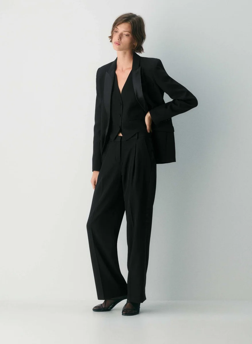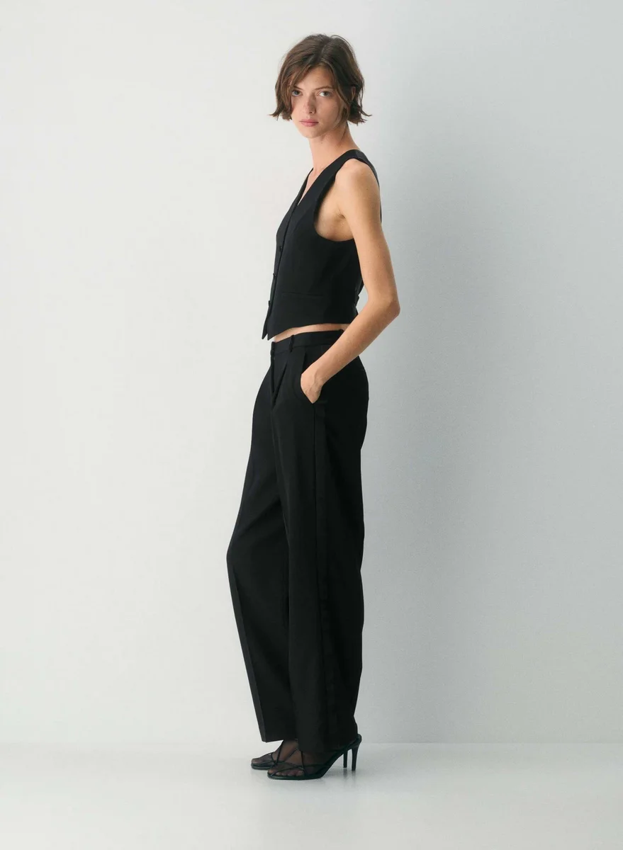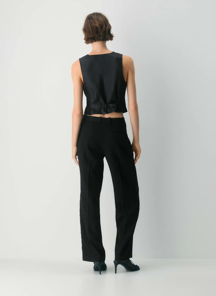 This is a V-neck vest with an adjustable back waist, slim fit and princess seams for shaping. It’s finely tailored with 100% virgin wool twill suiting fabric that has a refined look and feel and is sourced from Italy.