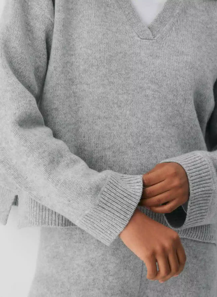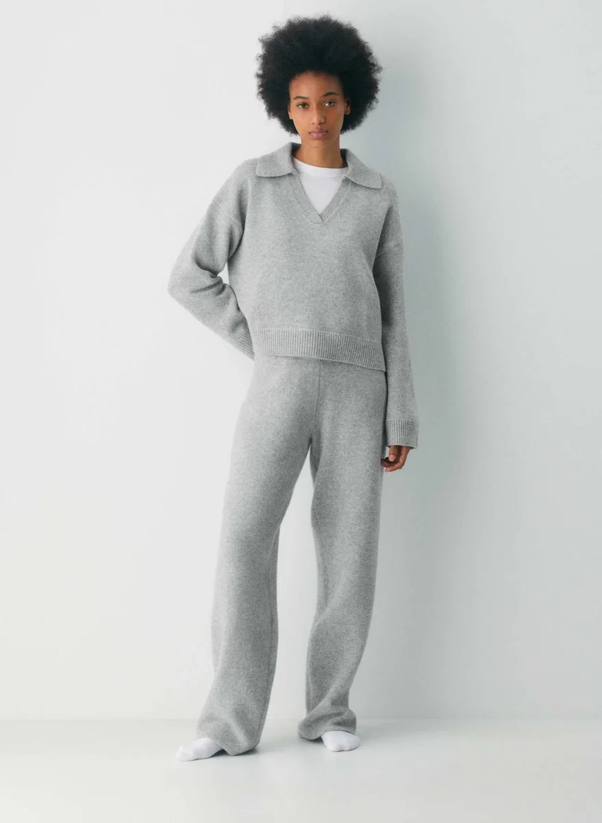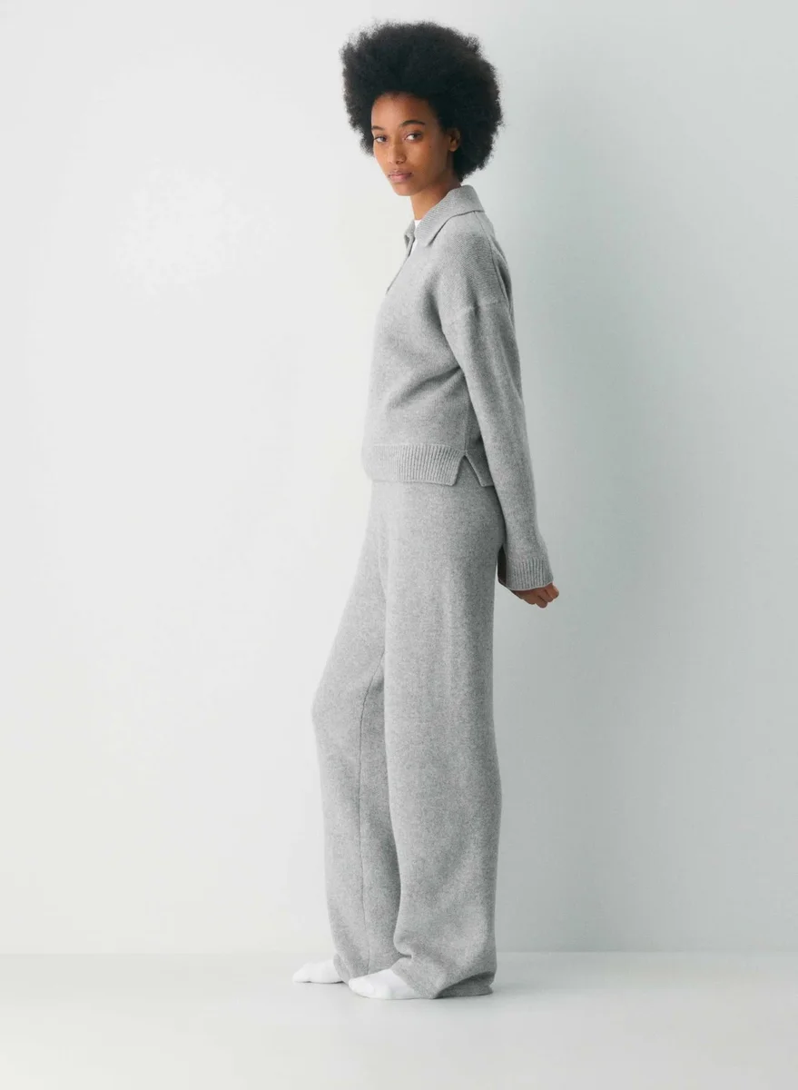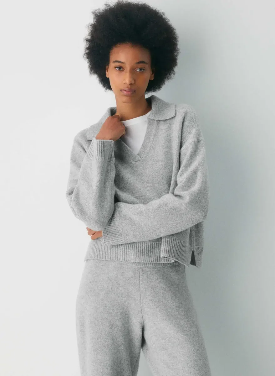 This is a polo sweater with a relaxed fit. It’s knit with responsibly sourced extra-fine merino wool with a lofty, cloud-like feel. This garment is constructed using a Jersey stitch for a soft drape and a smooth, flat feel.