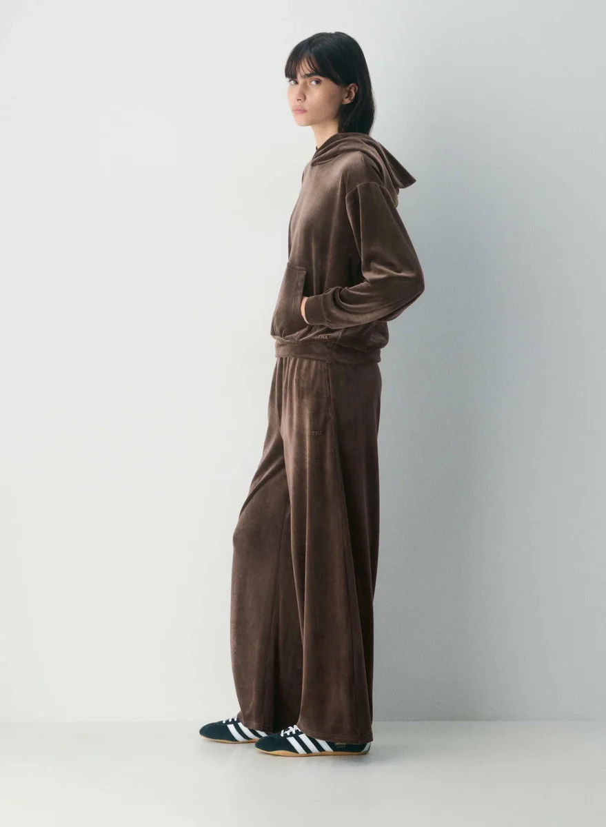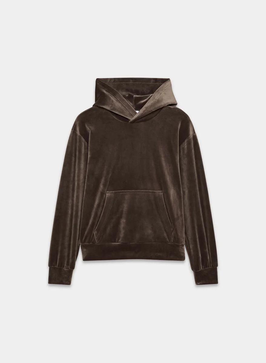 This is a hoodie with a kanga pocket and a classic fit. It’s made from ultra-soft velour with a cozy, textural feel.