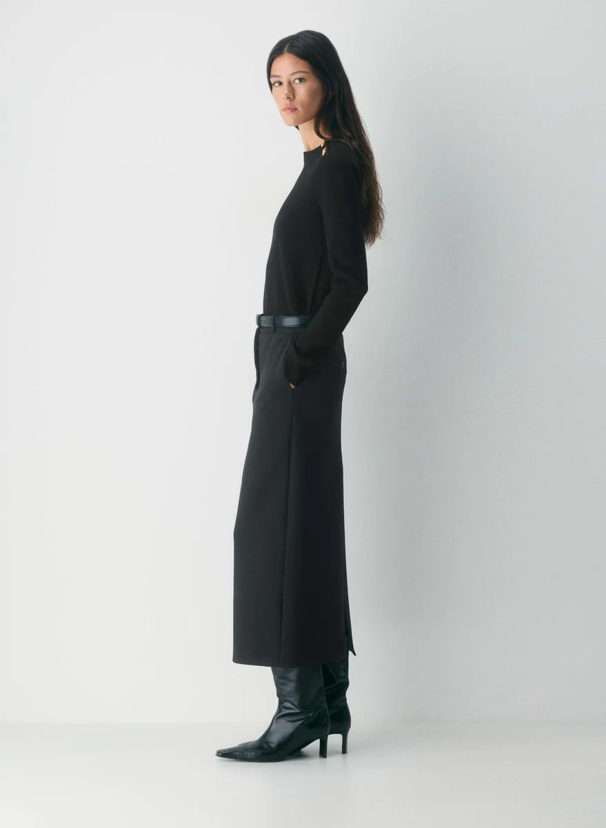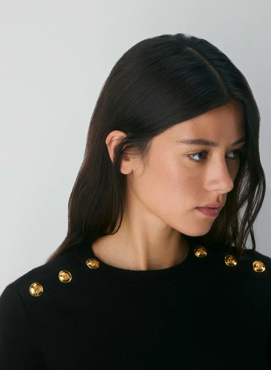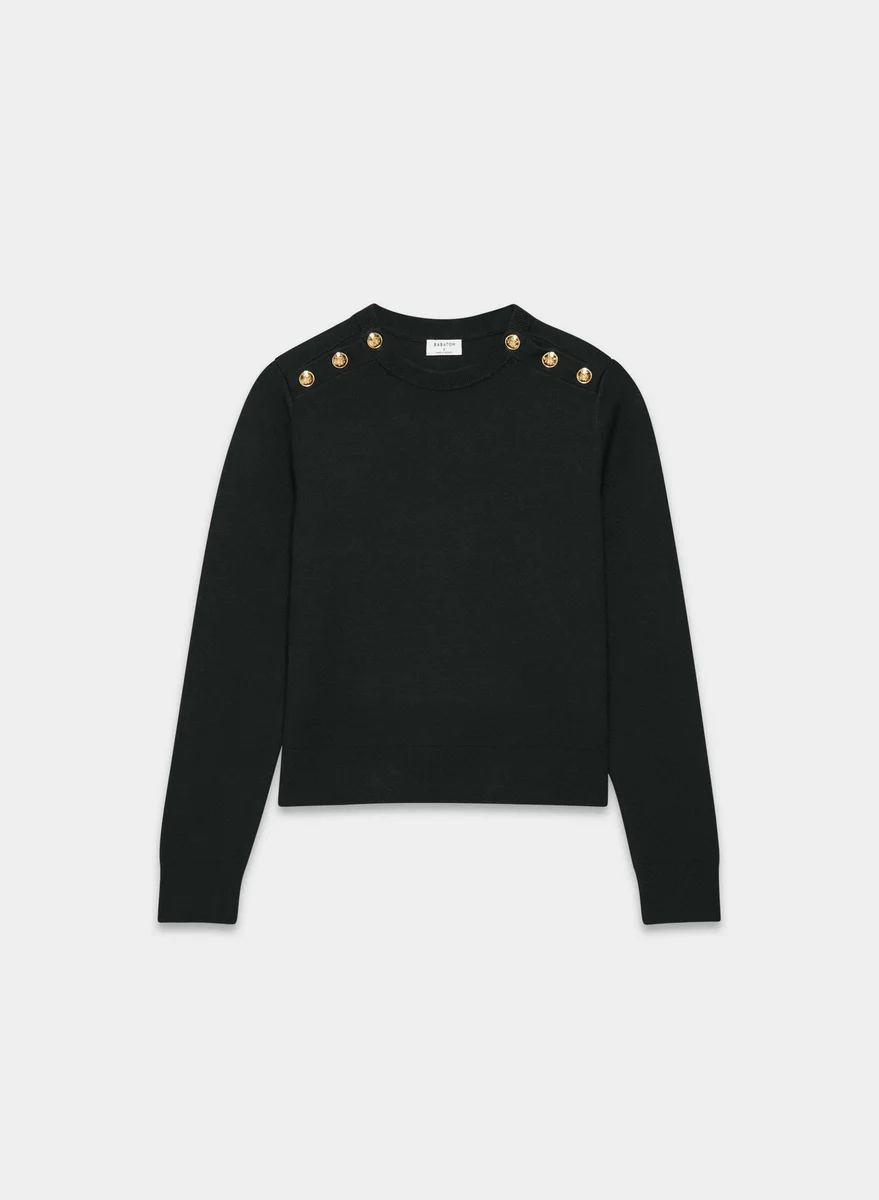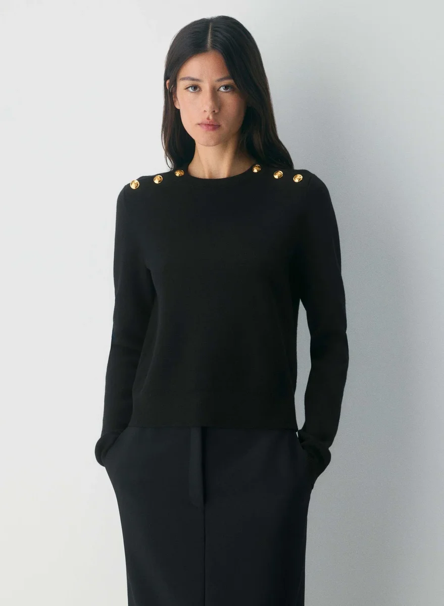 This is a crewneck sweater with button closures at the shoulders. It’s knit with Wonder Yarn — the lightweight yarn that lives up to its name. This fabric offers the peachy softness of wool, without the wool. It’s made with LENZING™ ECOVERO™ Viscose. This garment is constructed using a Double Jersey stitch for structure and a flat, dense feel.