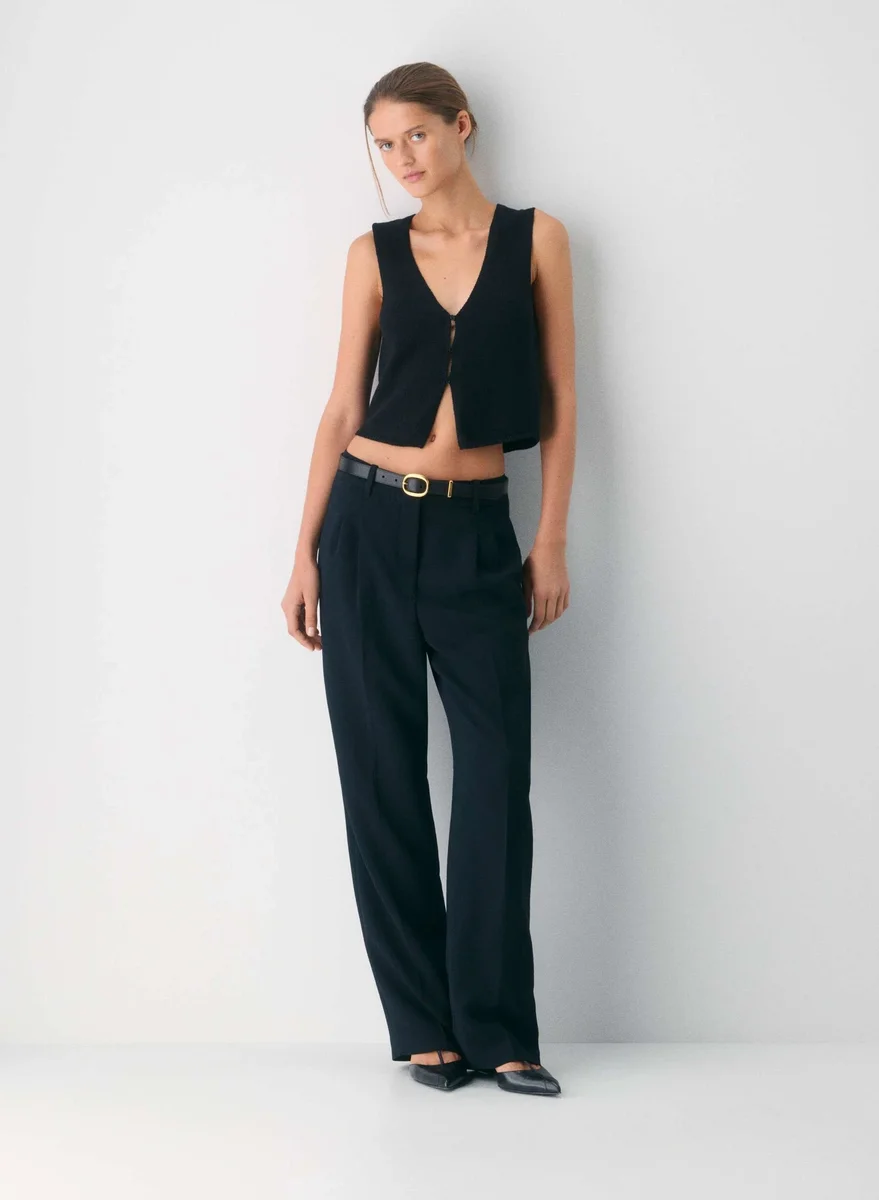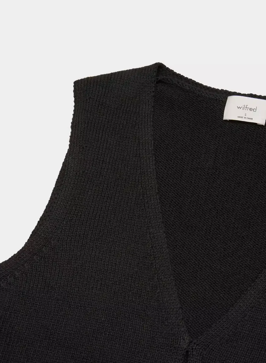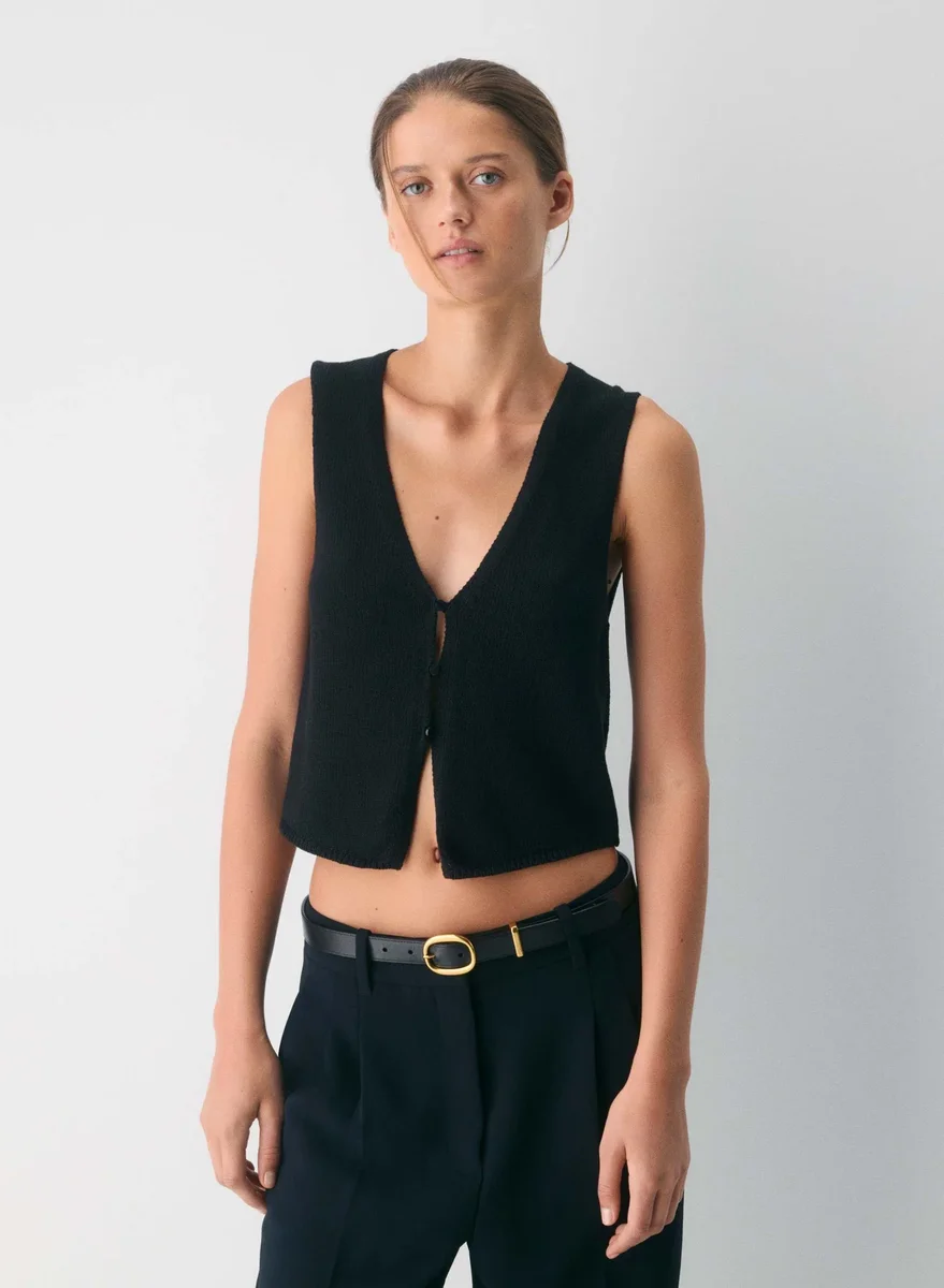 This is a fully fashioned sweater vest with a slim fit and button closure. It’s knit from soft 100% cotton yarn that’s naturally breathable for all-season wear. It’s constructed using a Jersey stitch for a soft drape and a smooth, flat feel.