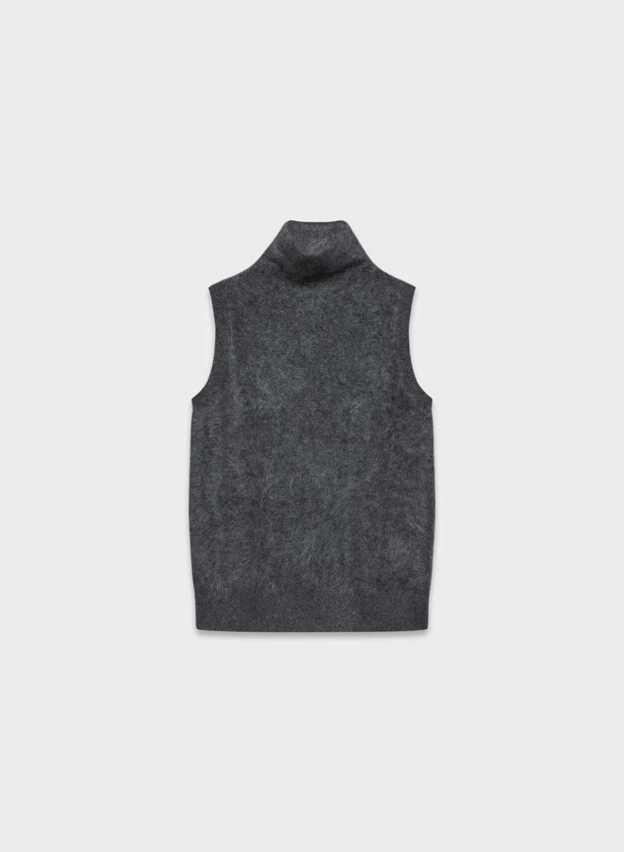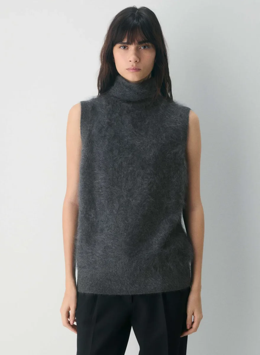 This is a mockneck sweater vest with a relaxed fit. It’s made with Aritzia’s Brushed Cashmere — lofty 100% cashmere yarn with a unique brushed and fluffy look, coveted for its distinctive softness and warmth. The finest available. This cashmere is verified to The Good Cashmere Standard®. It’s constructed with a Jersey stitch for a soft drape and a smooth, flat feel.