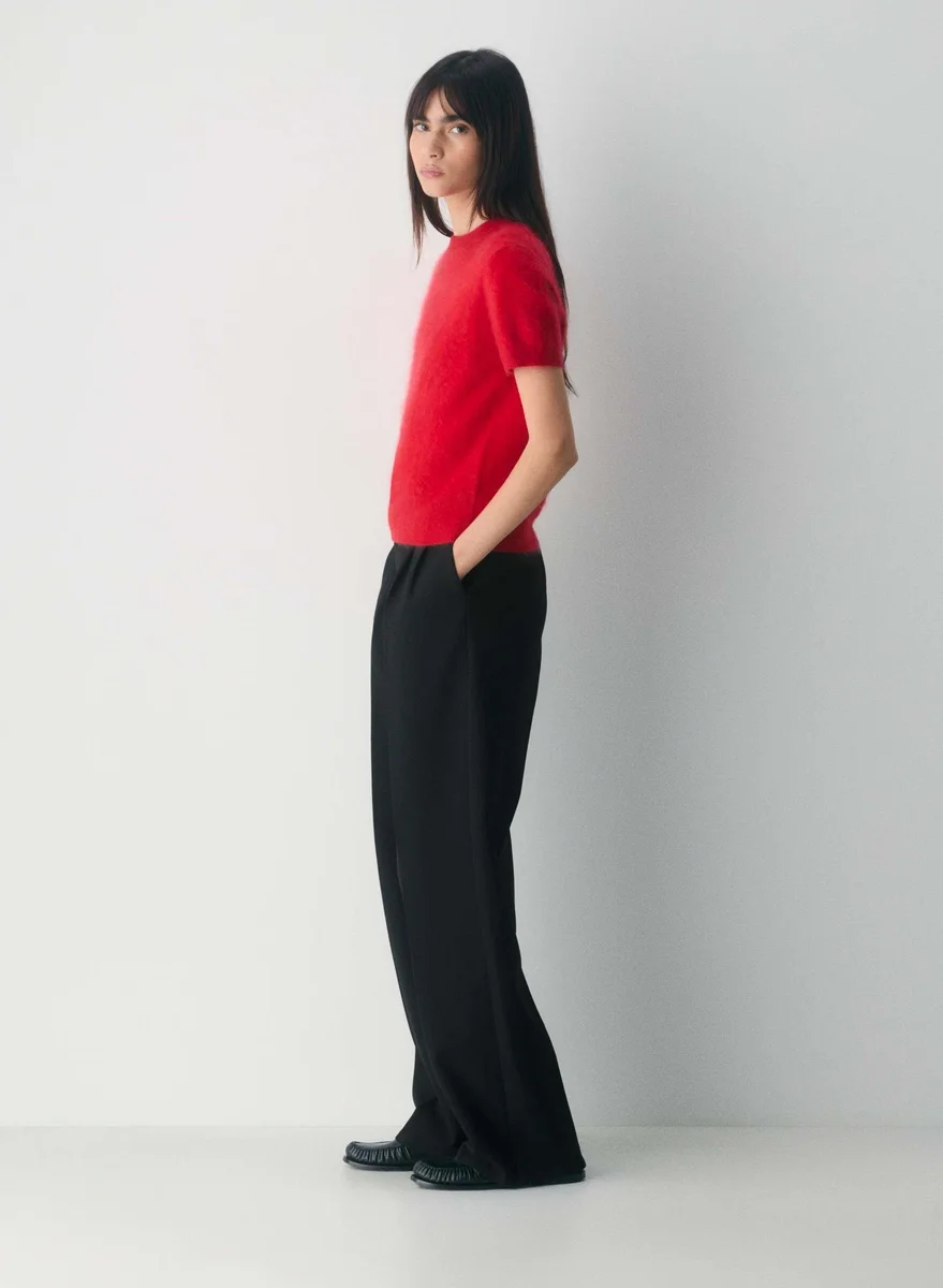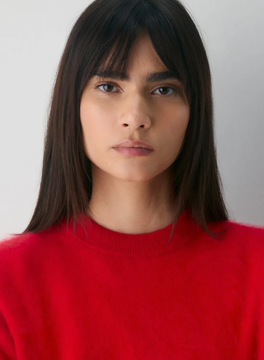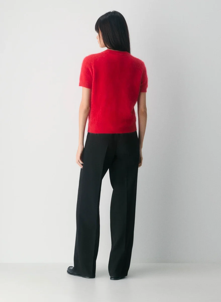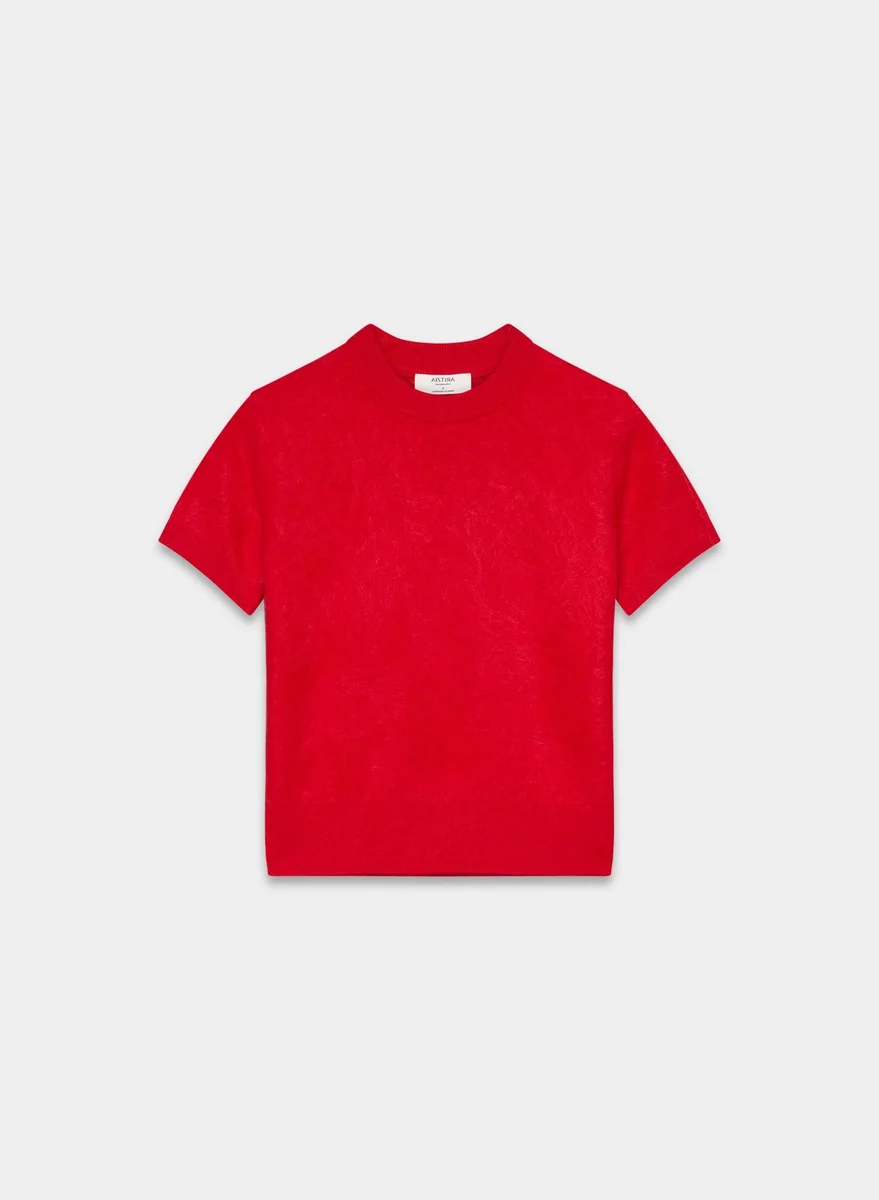 This is a shortsleeve sweater with a crew neckline and classic fit. It’s made with Aritzia’s Brushed Cashmere — lofty 100% cashmere yarn with a unique brushed and fluffy look, coveted for its distinctive softness and warmth. The finest available. This cashmere is verified to The Good Cashmere Standard®. This version is constructed using a Jersey stitch for a soft drape and a smooth, flat feel.