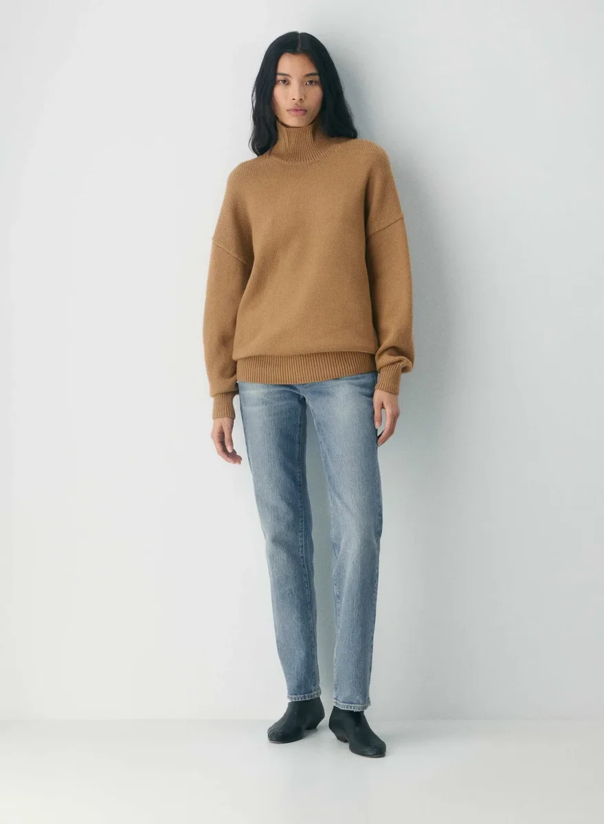 This is a fully fashioned turtleneck sweater with an oversized fit. It’s knit with Aritzia’s Chunky Merino Wool — heavyweight 100% extra-fine merino wool yarn coveted for its natural warmth and soft feel, and specially knit for a chunky look. This luxurious yarn is made with responsibly sourced wool. This version is constructed using a Jersey stitch for a soft drape and a smooth, flat feel.