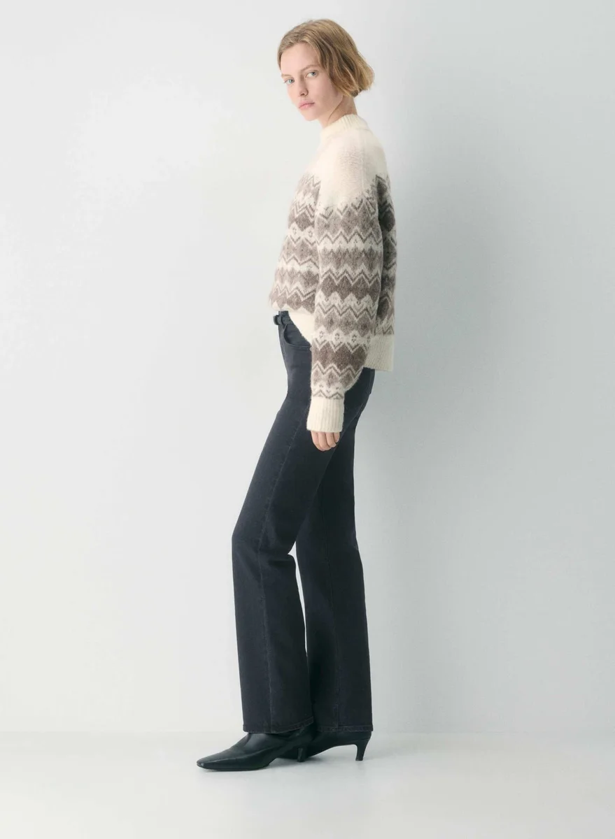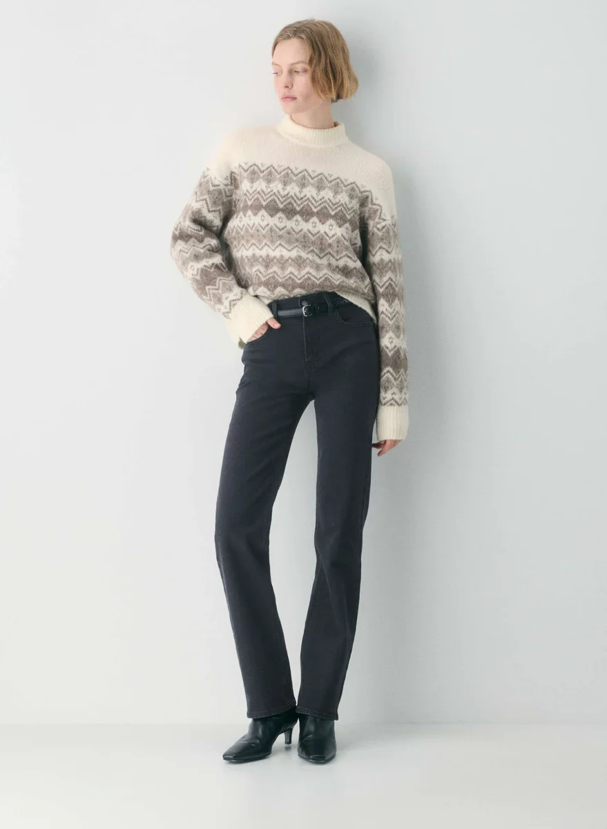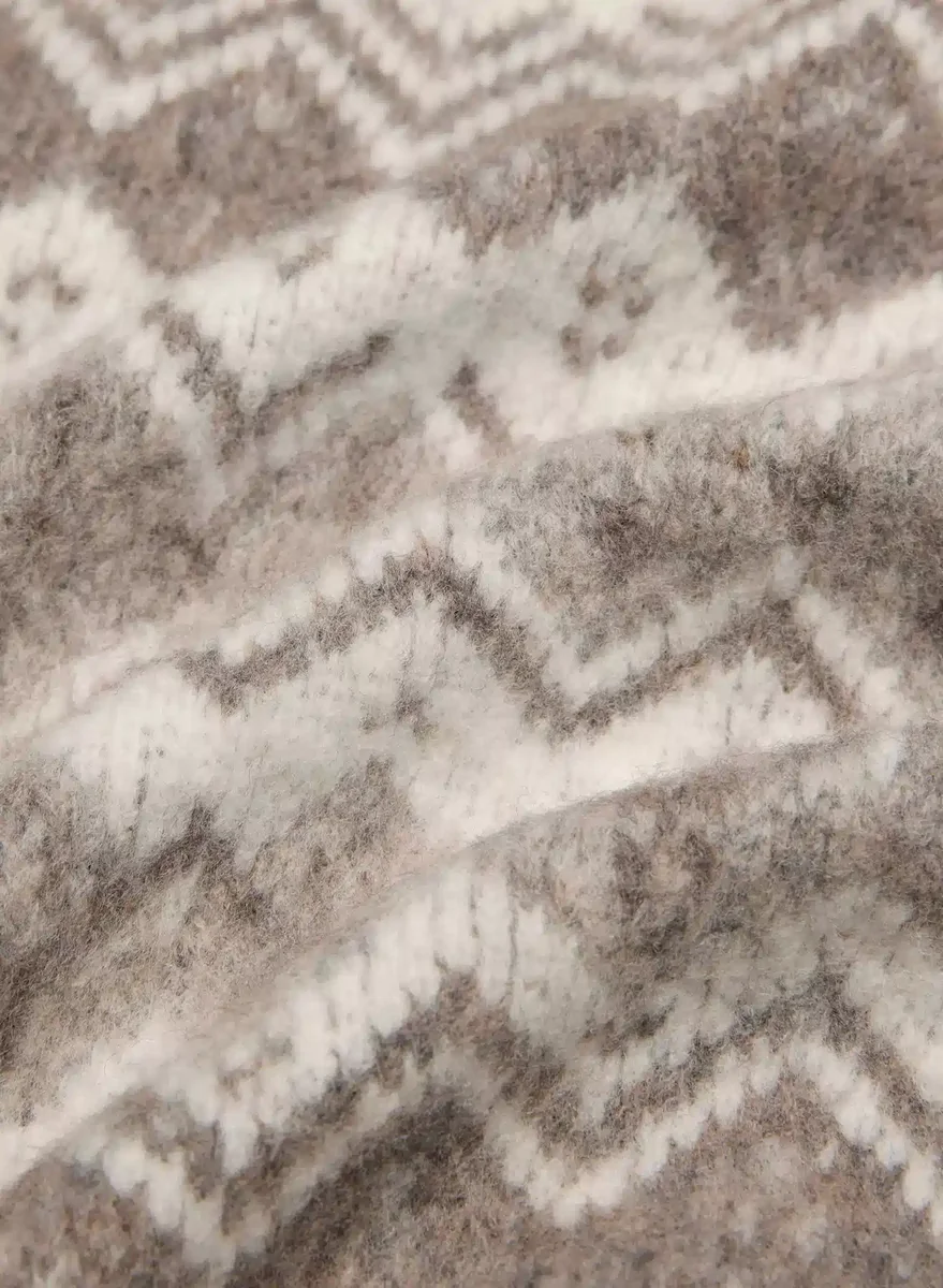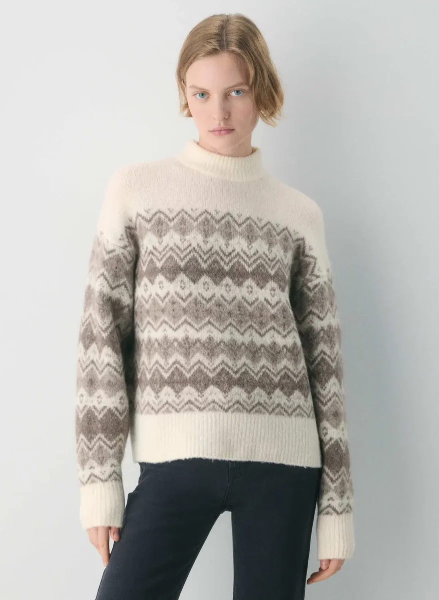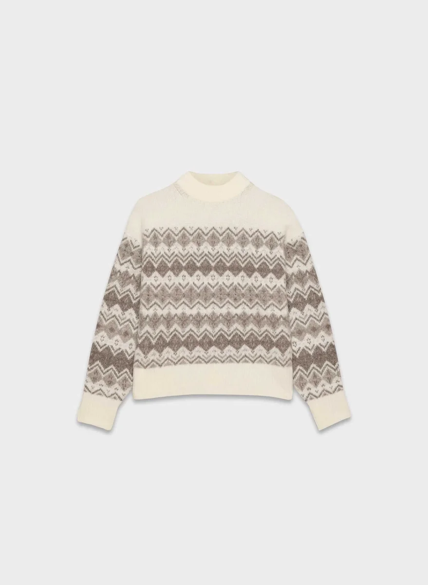 This is a mockneck sweater with ribbed detailing. It’s knit with extra-fine merino wool from a premier Italian mill. This lofty yarn provides equal parts warmth and softness. This version comes in an exclusive Fair Isle jacquard design and is constructed with a Jersey stitch for a soft drape and a smooth, flat feel.