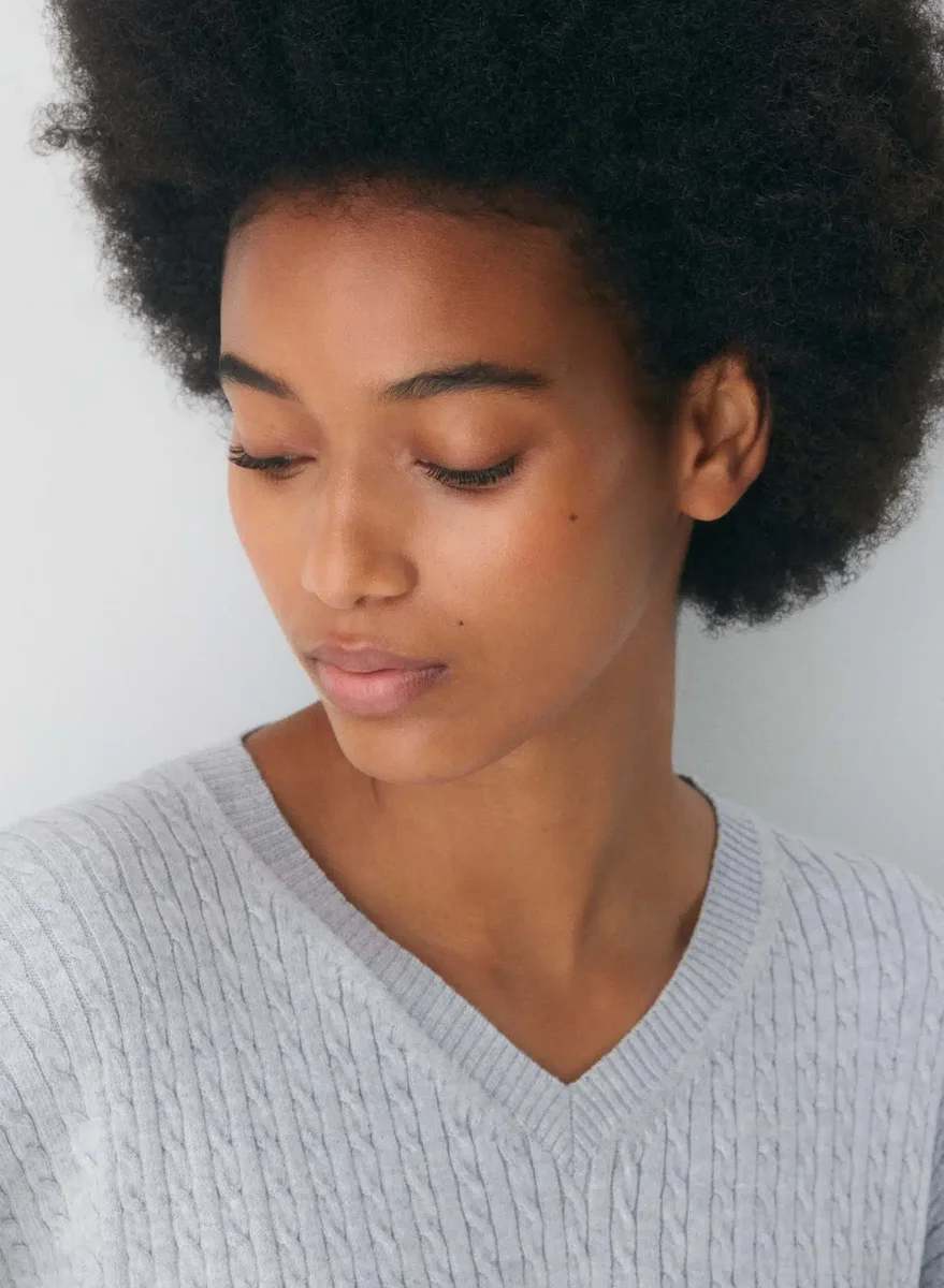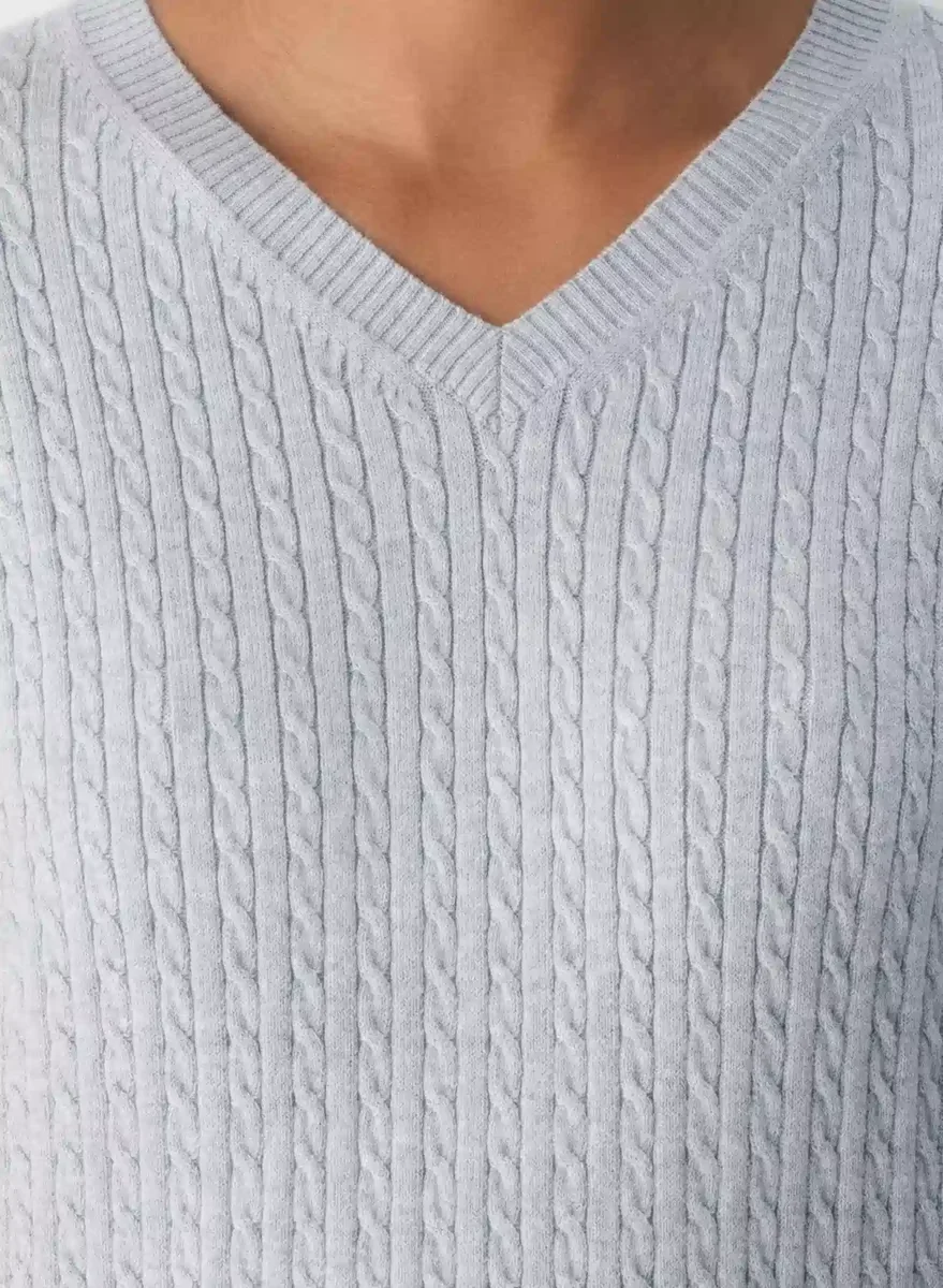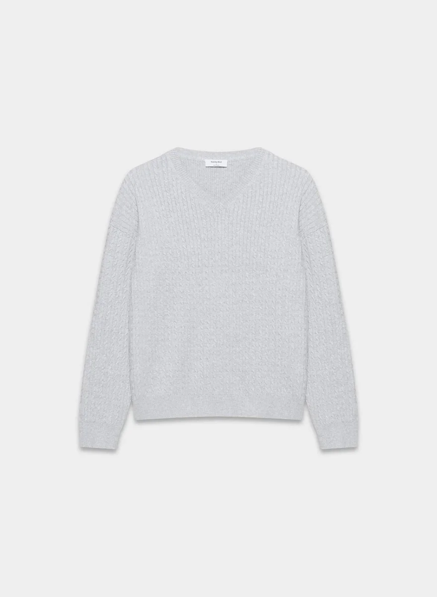 This is a fully fashioned V-neck sweater with a classic fit. It’s knit with Cotton Charm™ — organic cotton and cashmere yarn that’s exceedingly soft and perfect for year-round wear. This garment is constructed with a Cable stitch in a unique, custom design for a three-dimensional look and texture.