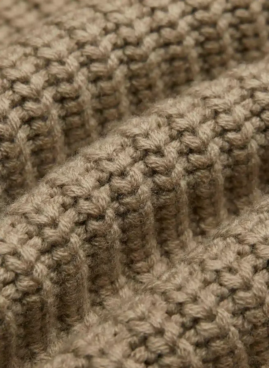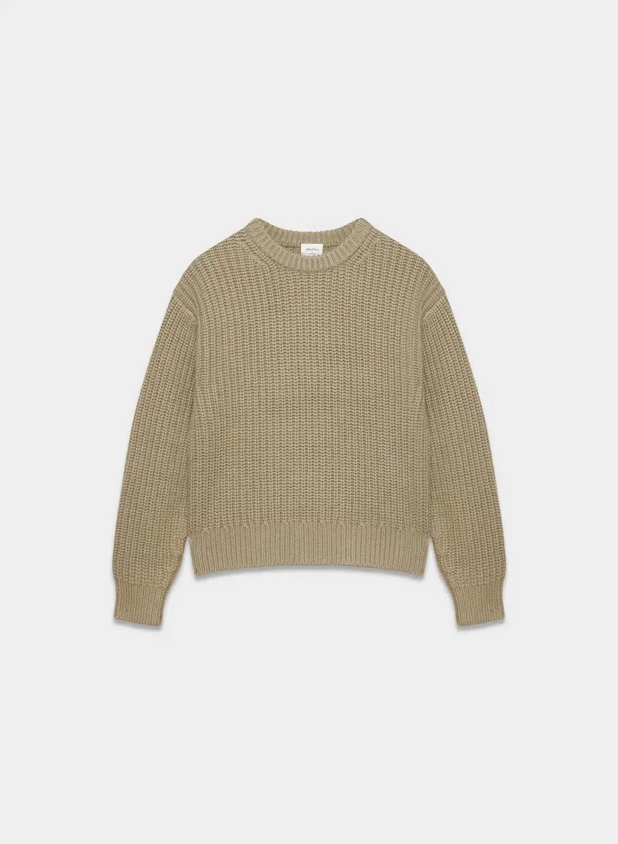 This is a fully fashioned crewneck sweater with dropped shoulders for an effortless, roomier fit. It’s made with 100% extra-fine merino wool for a warm, soft feel. This version is constructed using a Half Cardigan stitch with vertical ribs for a textural look.