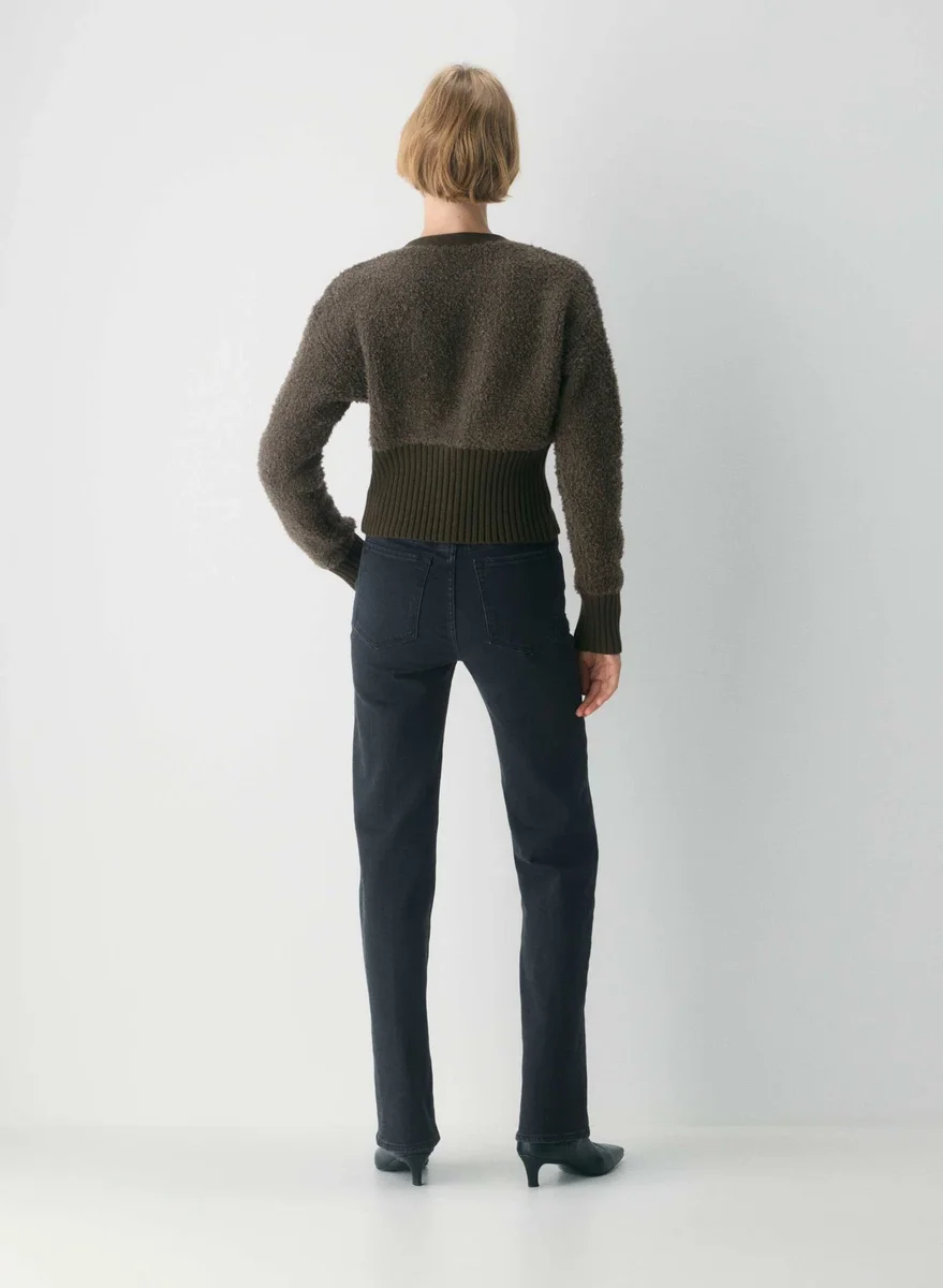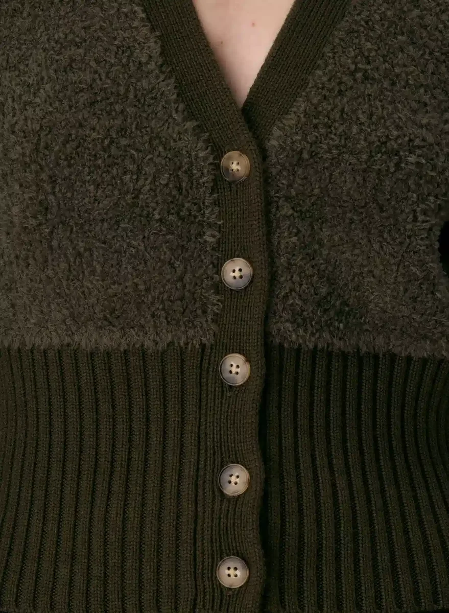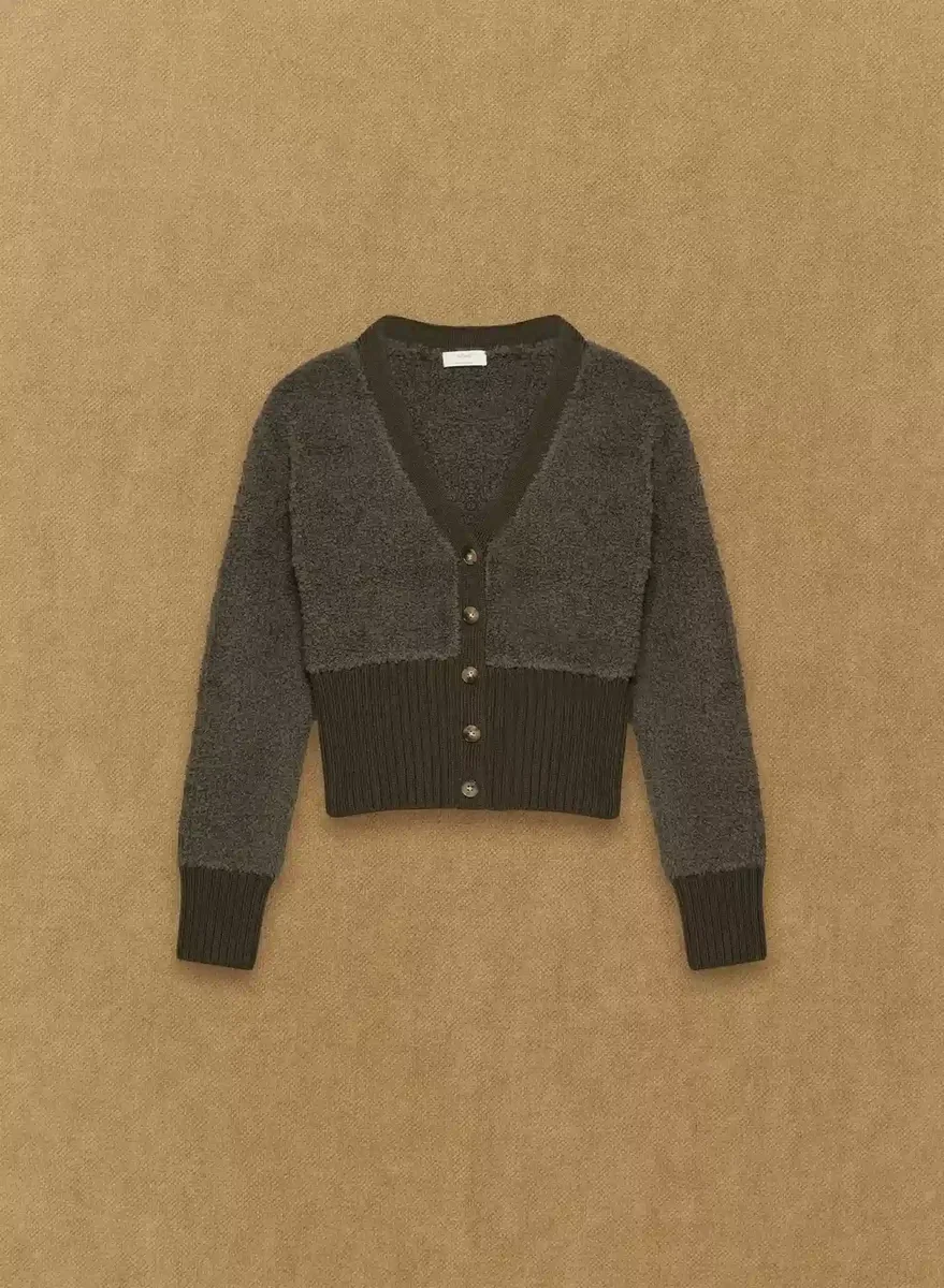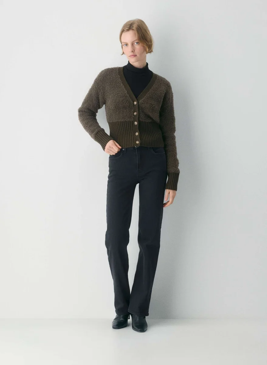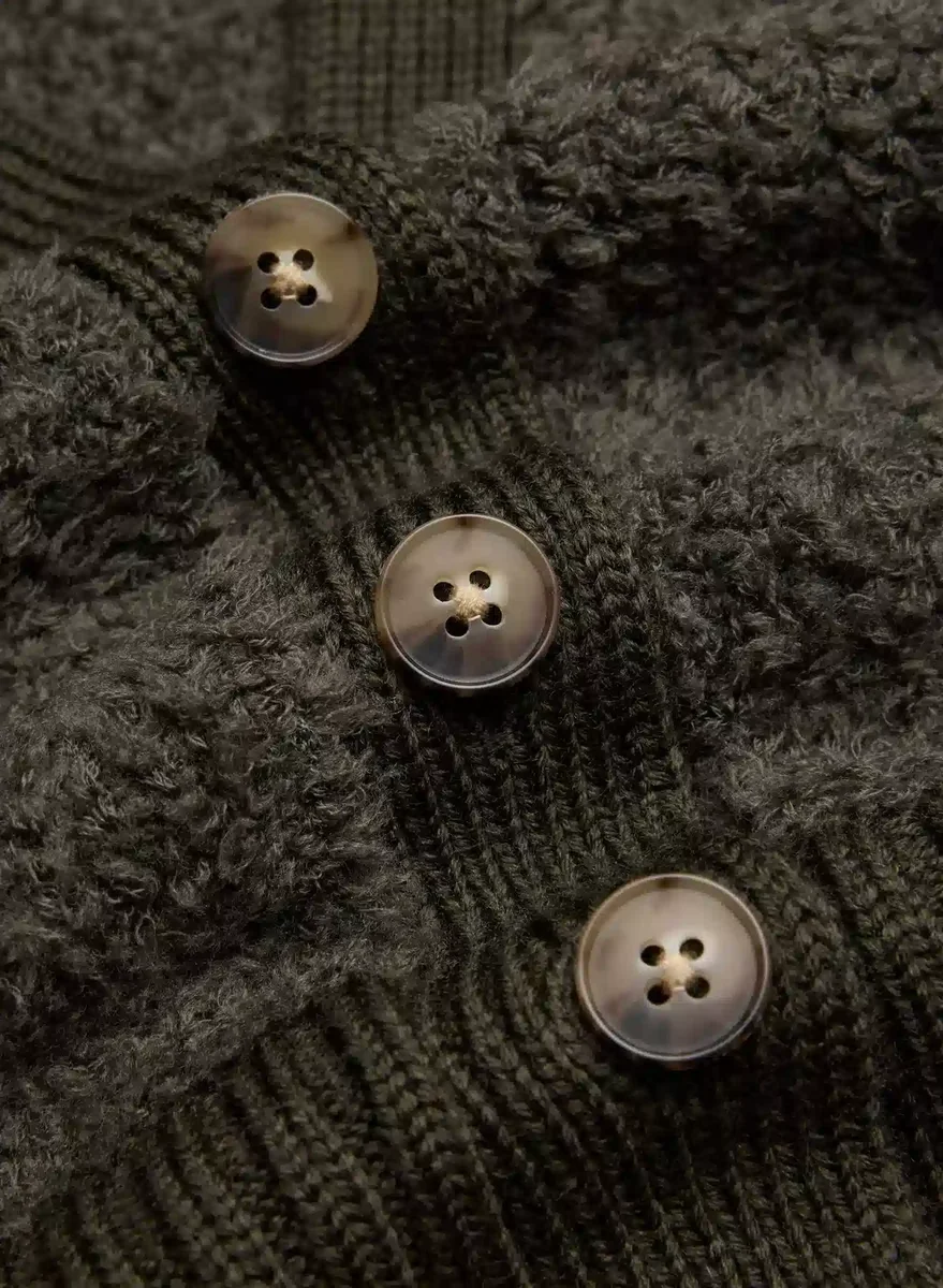 How regalThis is a V-neck cardigan with a classic fit. It’s knit using responsibly sourced wool yarn with a soft, textured feel. It’s constructed using a