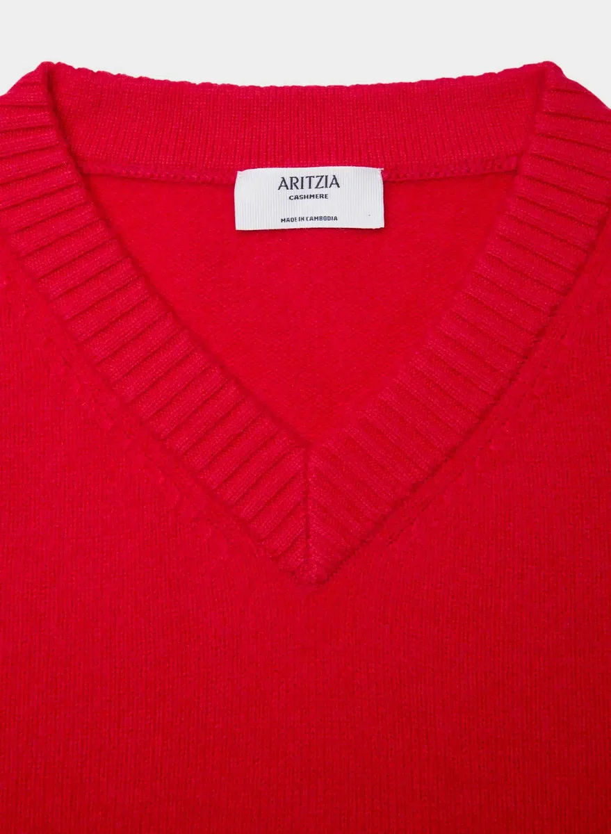 Looks sharp, feels softThis is a fully fashioned V-neck sweater with a classic fit. It’s knit with Aritzia’s Essential Cashmere — perfectly balanced midweight 100% cashmere yarn coveted for its signature softness and warmth. The finest available. This cashmere is verified to The Good Cashmere Standard®. This garment is constructed using a Jersey stitch for a soft drape and a smooth, flat feel.