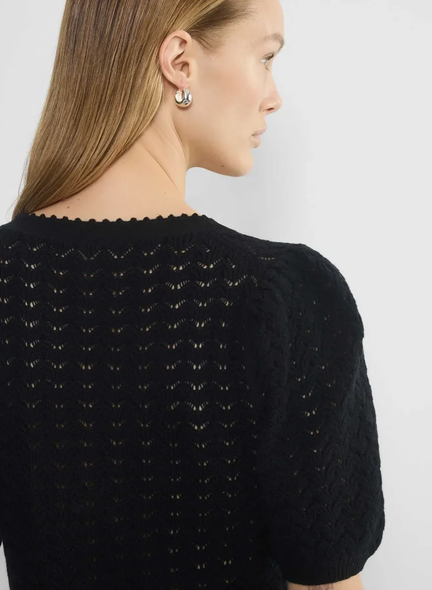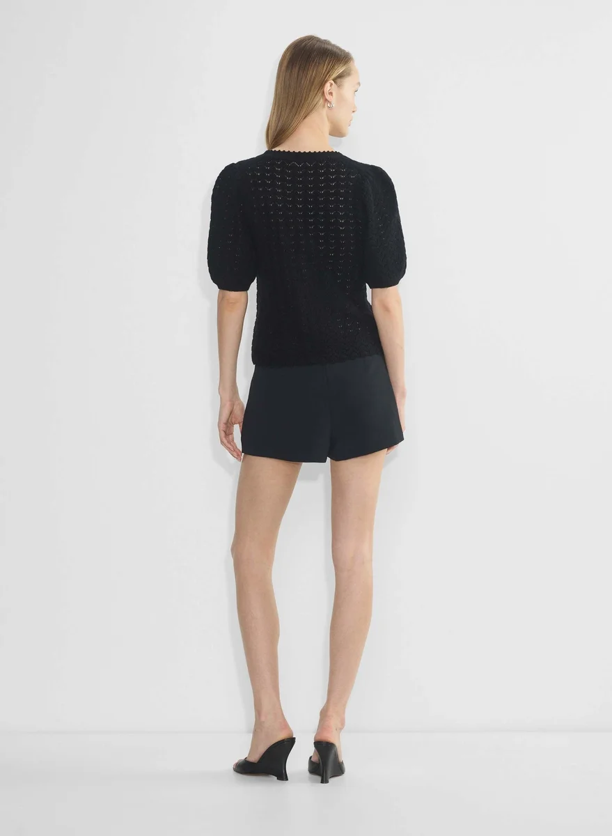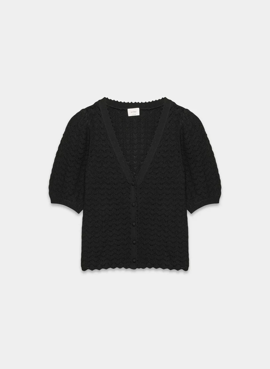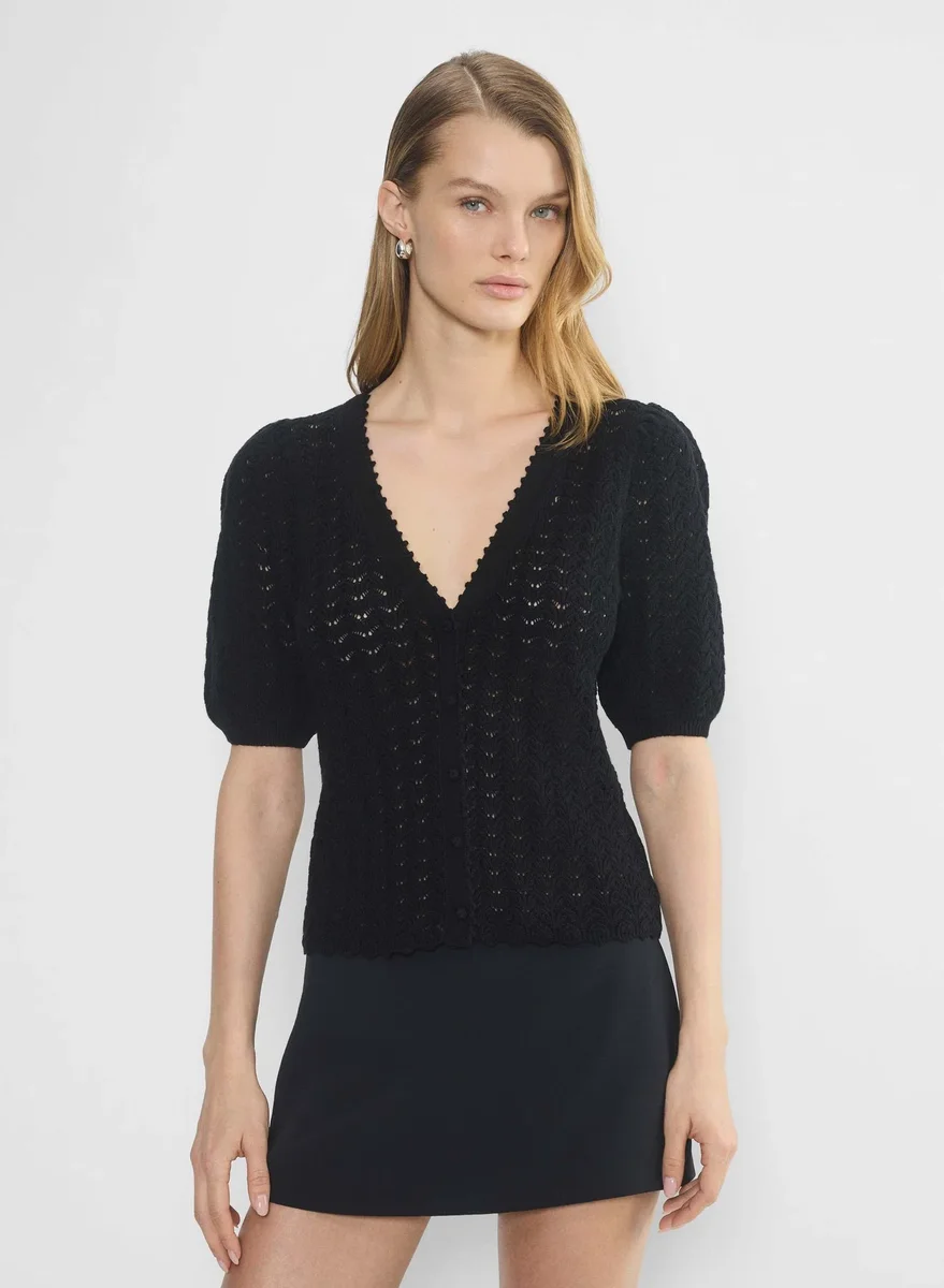 This is a fully fashioned V-neck cardigan with puff sleeves and hand-crocheted finishes. It’s knit with Breeze Merino — extra-fine merino wool and cotton yarn with lightweight, all-season warmth and a soft feel. It’s made with responsibly sourced wool. This garment is constructed with a Scallop stitch for a delicate look and airy feel.