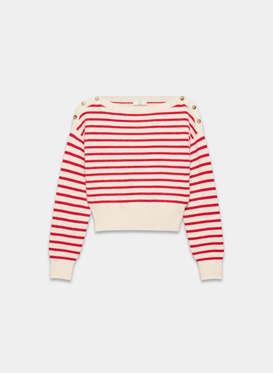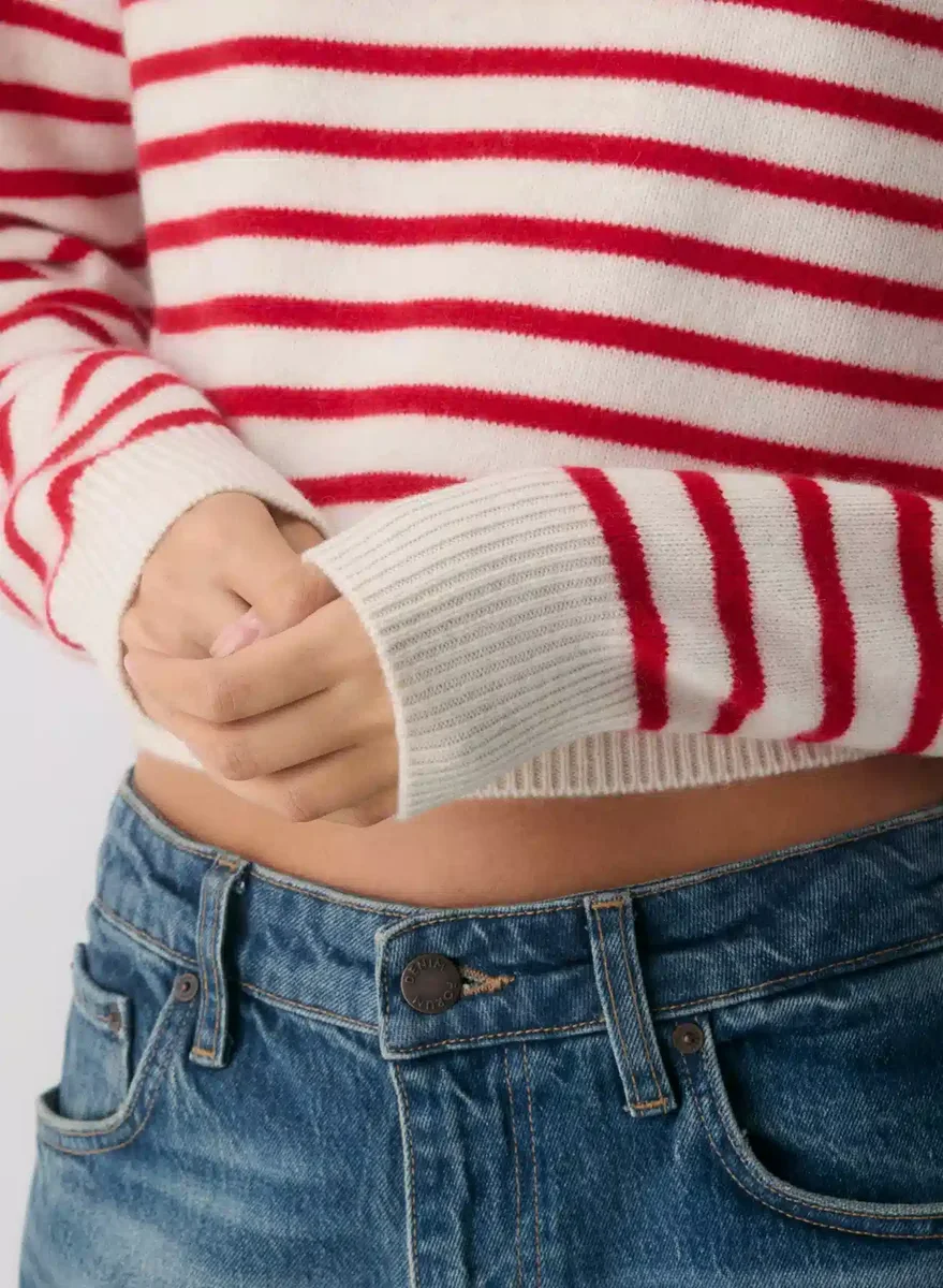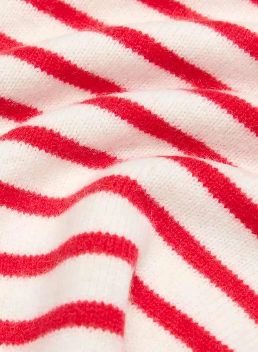 This is a fully fashioned boatneck sweater with dropped shoulders. It’s knit with a lofty, spongey yarn that’s naturally warm and luxuriously soft. The yarn is made with cashmere verified to The Good Cashmere Standard® by AbTF and responsibly sourced wool. It’s constructed using a Jersey stitch for a soft drape and a smooth, flat feel. This version features yarn-dyed stripes that have been woven in, as opposed to printed on, for a more dimensional look.