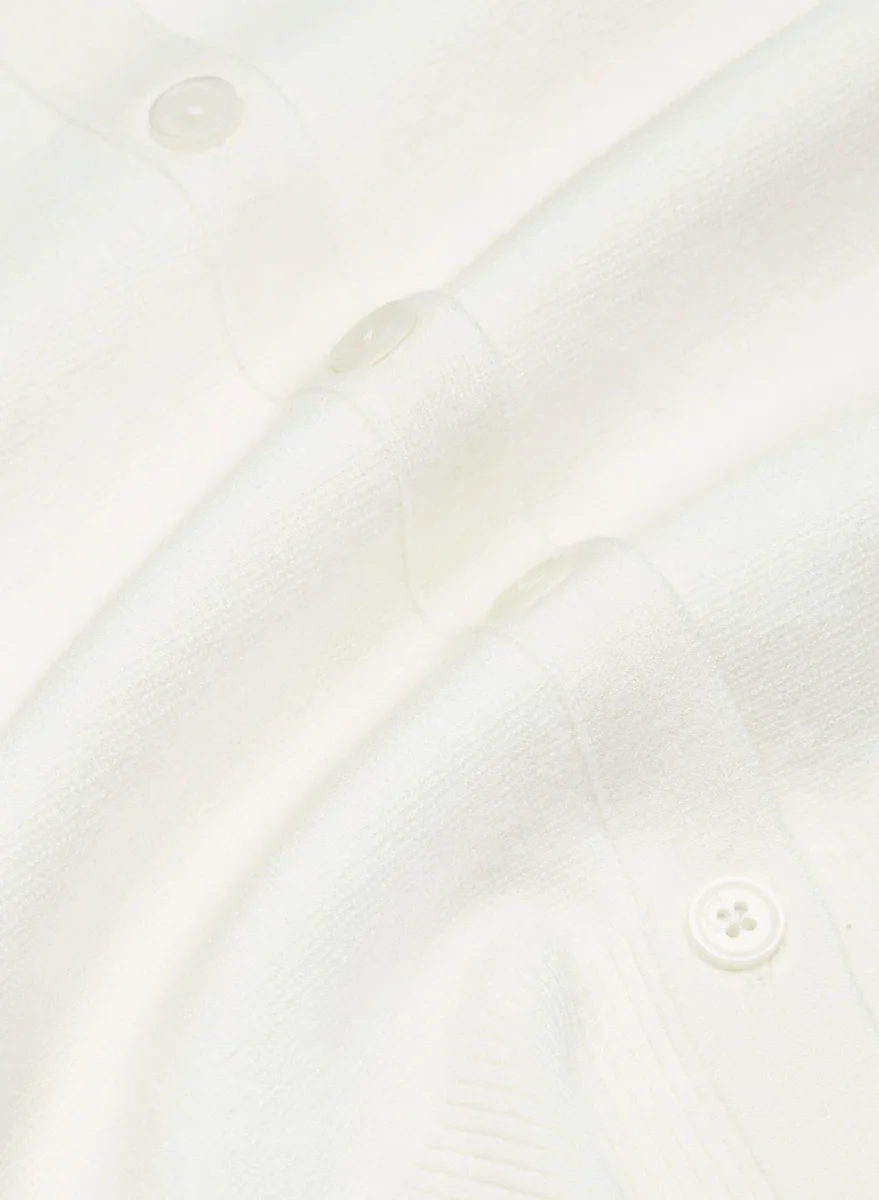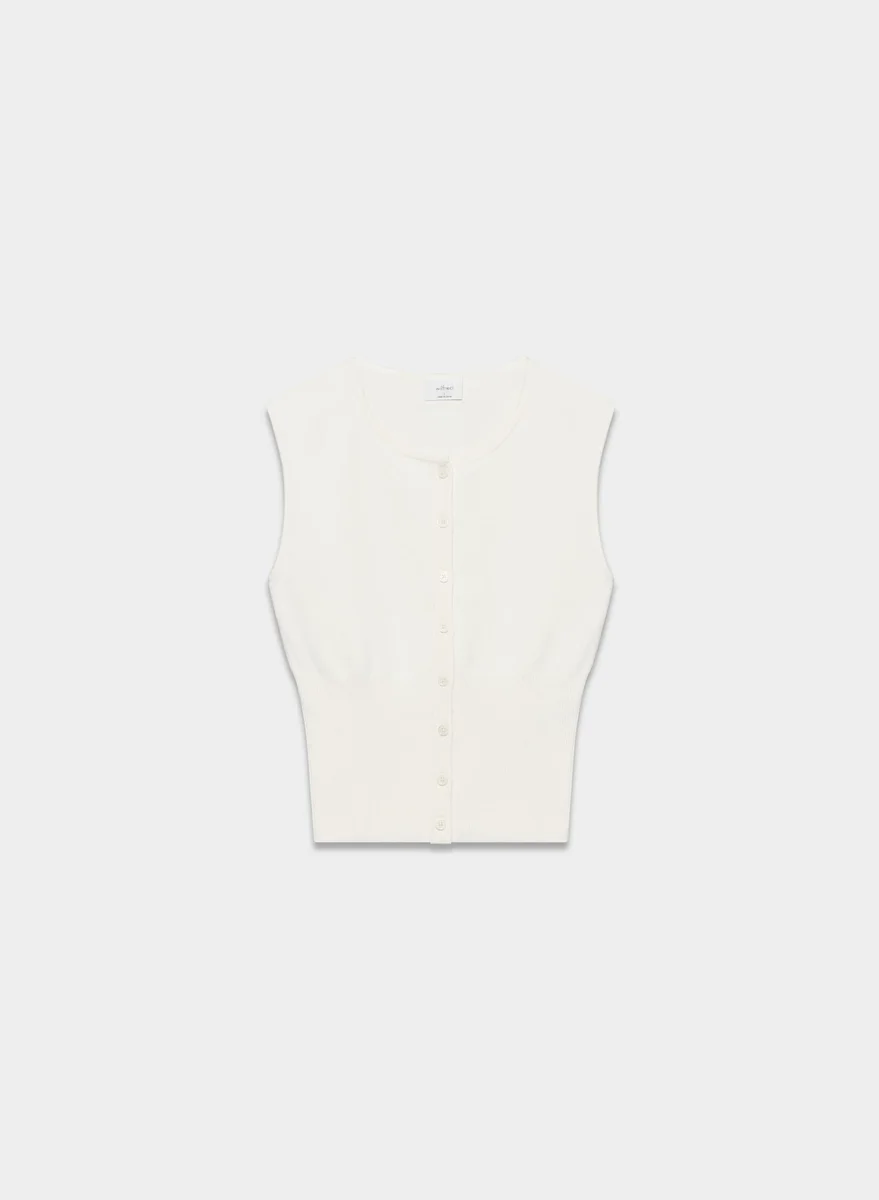 Your favourite cardi, minus the sleevesThis is a fully fashioned sleeveless crewneck cardigan with ribbed detailing. It’s made with Wonder Yarn — the