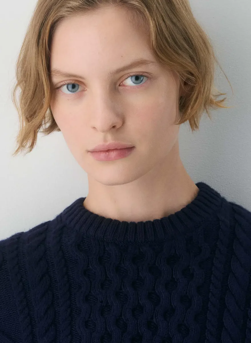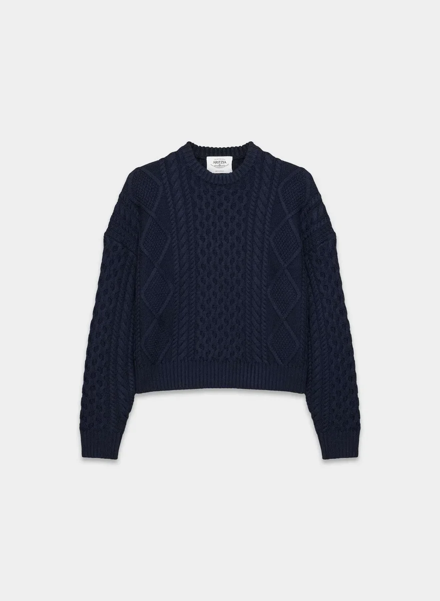 This is a fully fashioned sweater with a crew neckline and a relaxed fit. It’s made with Aritzia’s Merino Wool — lofty 100% extra-fine merino wool yarn coveted for its natural warmth and soft feel. This luxurious wool yarn is responsibly sourced. This version is constructed using our Coastal Cable stitch, a classic cable-knit pattern with mixed decorative accents for a textural look and feel.