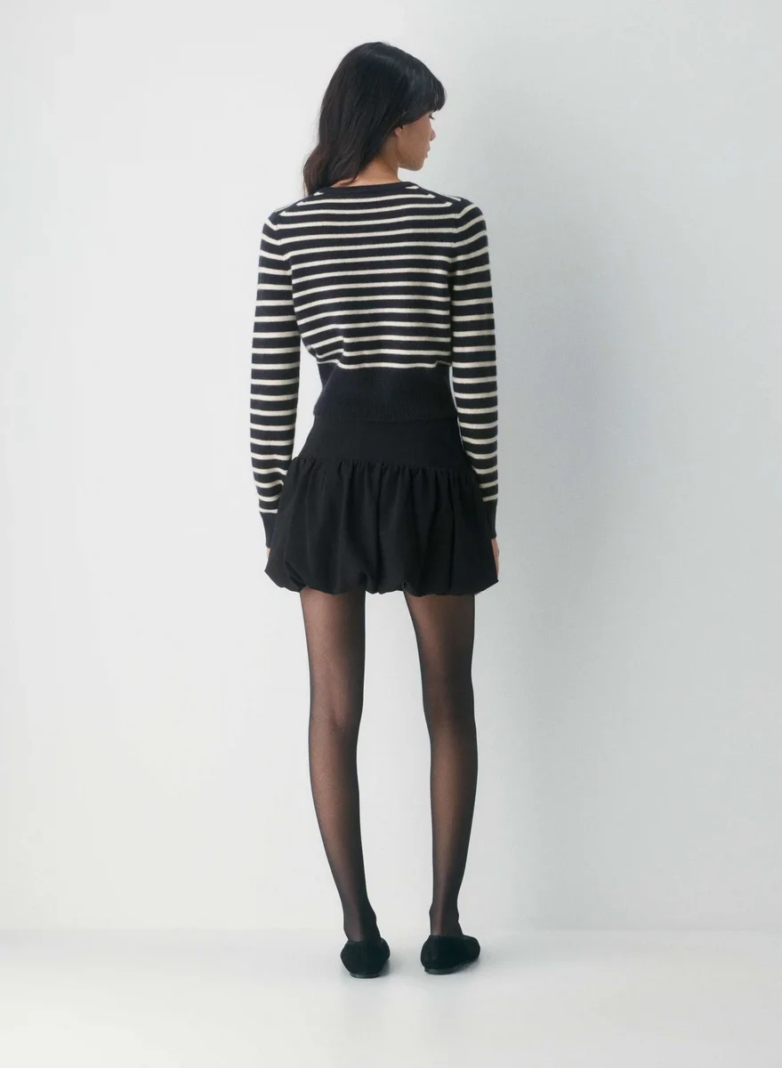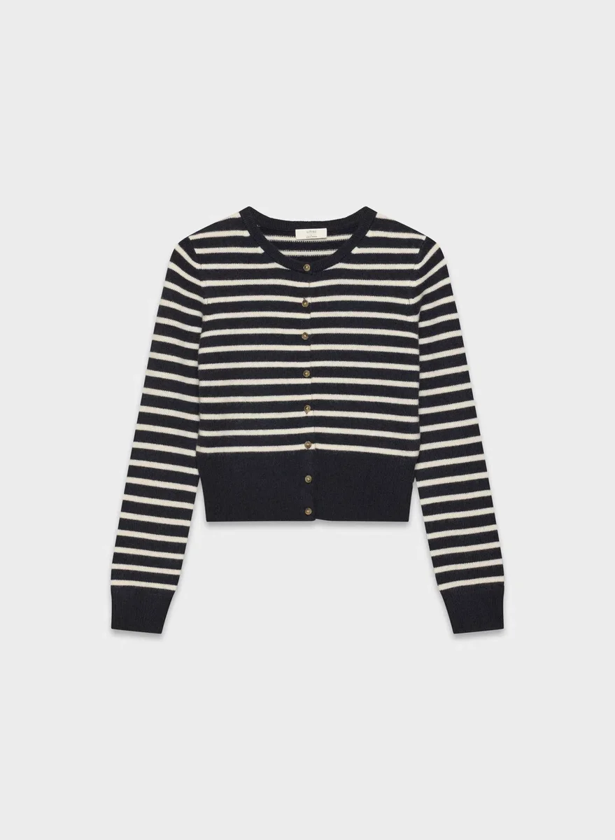 This is a fully fashioned crewneck cardigan with a classic fit. It’s knit from a lofty, spongey yarn that’s naturally warm and luxuriously soft. The yarn is made with cashmere verified to The Good Cashmere Standard® by AbTF and responsibly sourced wool. It’s constructed using a Jersey stitch for a soft drape and a smooth, flat feel. This version features a yarn-dyed stripe that has been woven in, as opposed to printed on, for a more dimensional look.