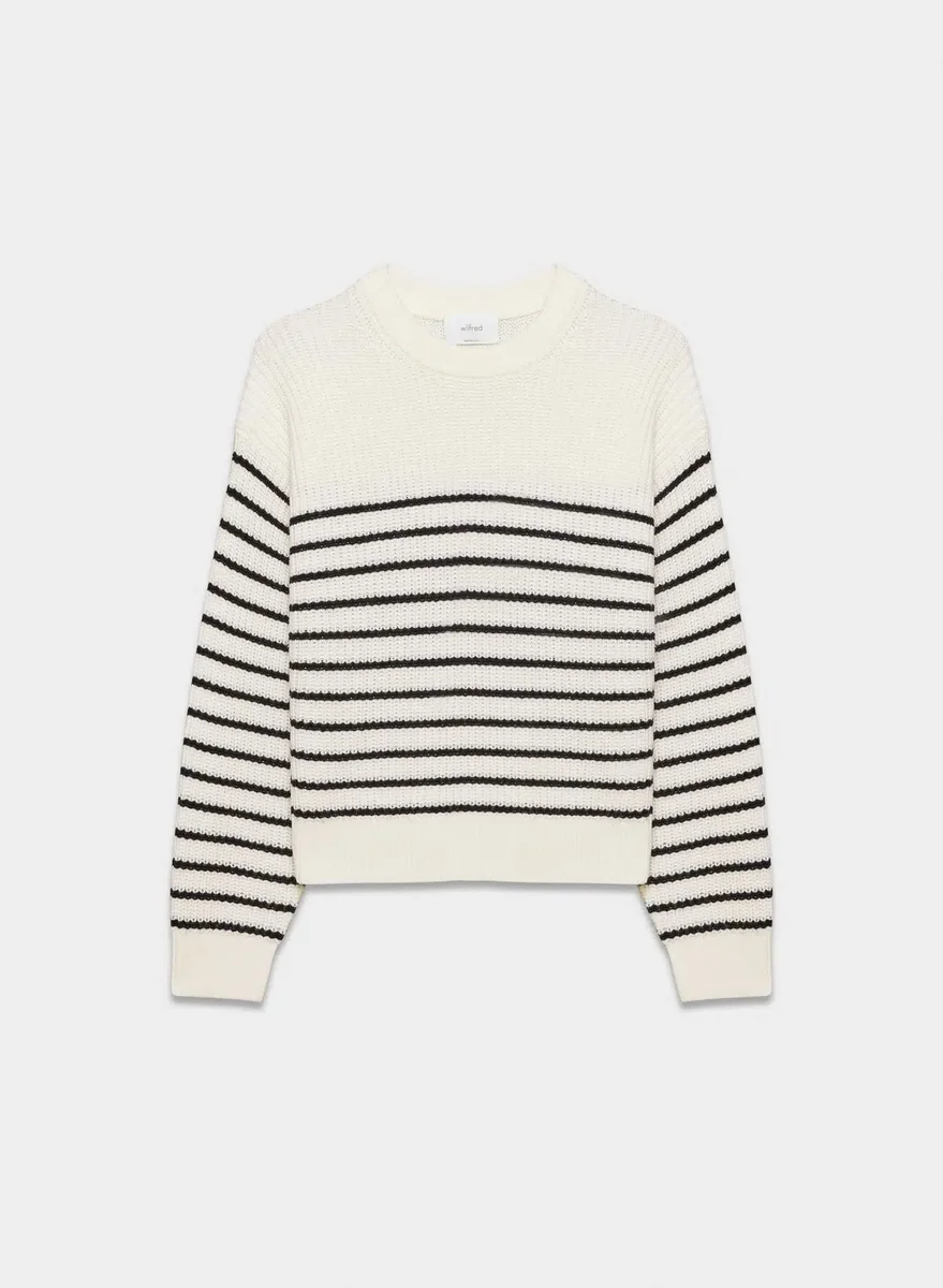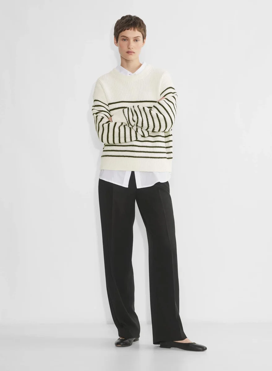 This is a relaxed crewneck sweater with dropped shoulders and fully fashioned construction. It’s knit with Embrace Merino™ — extra-fine 100% merino wool yarn coveted for its natural warmth and super soft feel. We source ours from a premier Italian mill. This version features a yarn-dyed striped pattern that has been woven in, as opposed to printed on, for a more dimensional look. A Half Cardigan stitch creates vertical ribs for a textural look and feel.