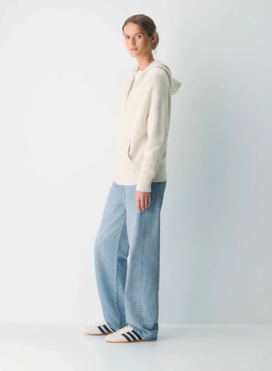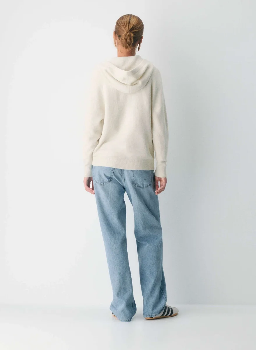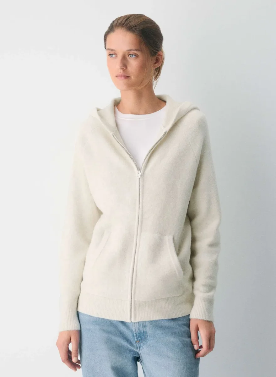 This is a fully fashioned zip-up hoodie with raglan sleeves, a kanga pocket and a relaxed fit. It’s knit with Whipped Yarn — soft, airy yarn with a fuzzy, cloud-like texture and cozy feel. It’s constructed using a Jersey stitch for a soft drape and a smooth, flat feel.