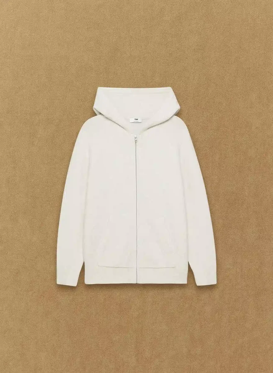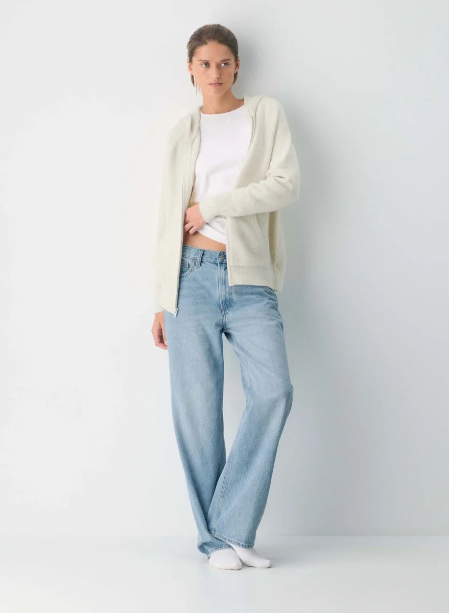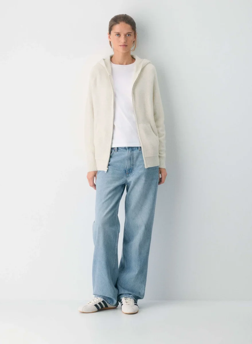 This is a fully fashioned zip-up hoodie with raglan sleeves, a kanga pocket and a relaxed fit. It’s knit with Whipped Yarn — soft, airy yarn with a fuzzy, cloud-like texture and cozy feel. It’s constructed using a Jersey stitch for a soft drape and a smooth, flat feel.