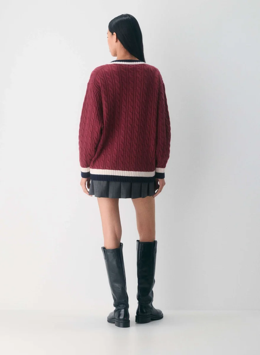 This is a fully fashioned V-neck sweater with a relaxed fit and ribbed trim. It’s knit with Infiniti Wool — responsibly sourced extra-fine merino wool and organic cotton yarn that’s naturally warm with an infinitely wearable, soft feel. This garment is constructed with a Cable stitch in a unique, custom design for a three-dimensional look and texture.