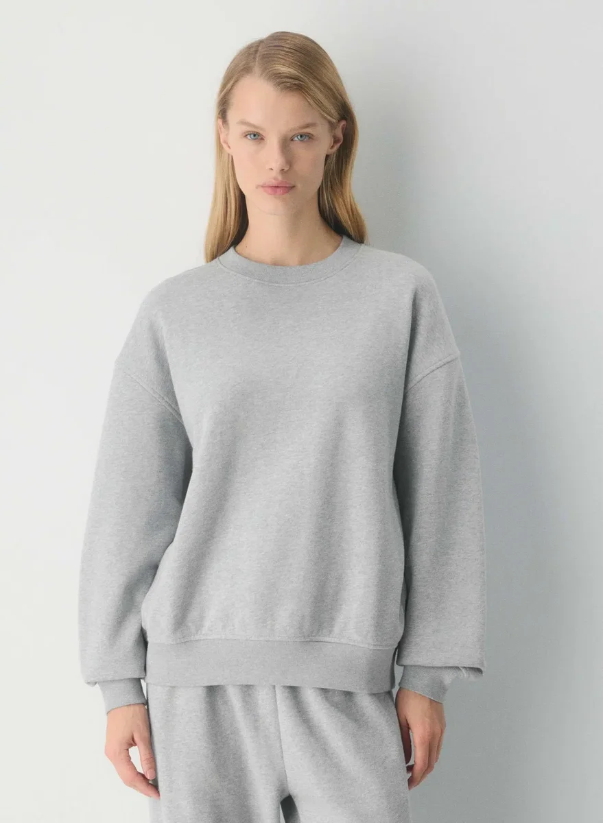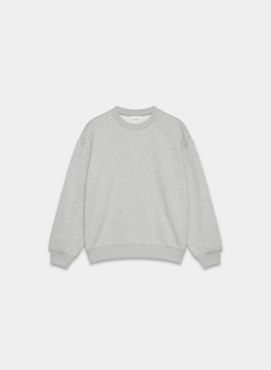 This is a crewneck pullover with dropped shoulders and a relaxed fit. It’s made from heavyweight French Terry with a looped back and drapey feel. This fabric is sourced from a premier Italian mill.