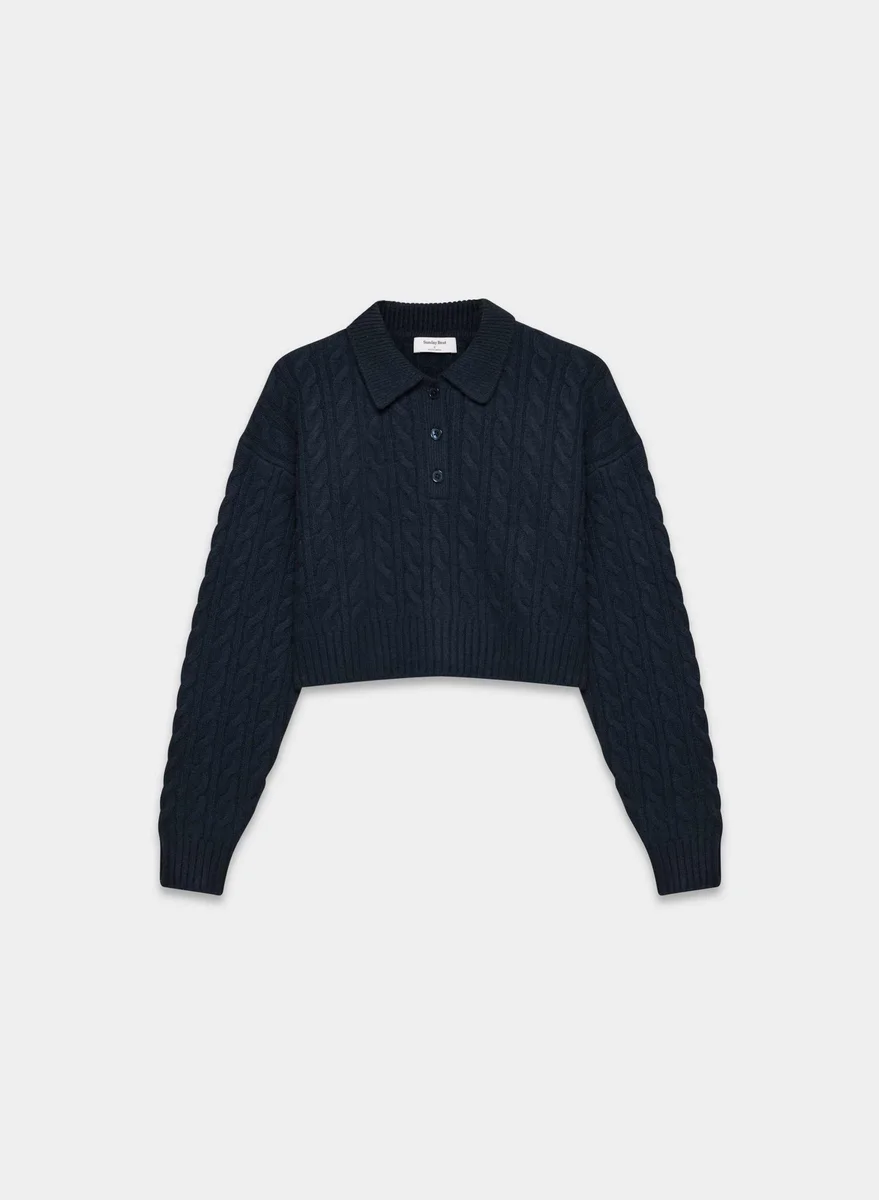 This is a polo sweater with a button placket. It’s knit with responsibly sourced extra-fine merino wool and organic cotton yarn that’s cozy, soft and naturally warm. It’s constructed using our Preppy Cable stitch in a unique repeated pattern for a three-dimensional look and texture. Go team.