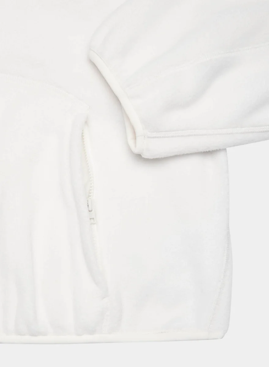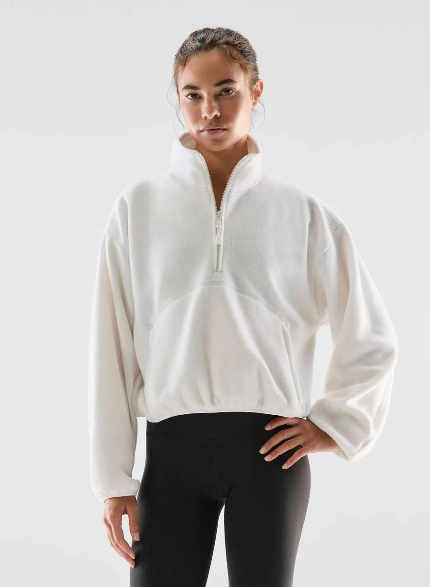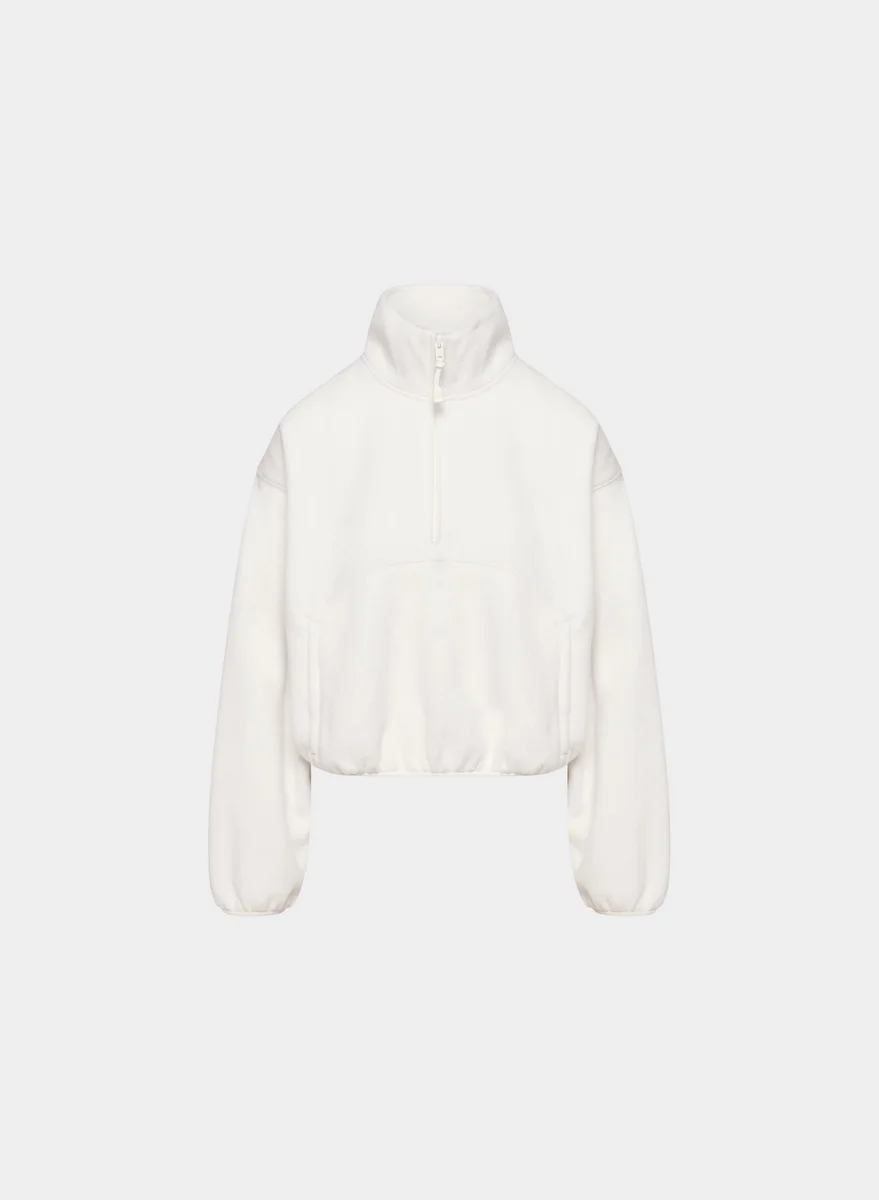 This is an oversized mockneck zip-up with zippered pockets. It’s made with plush, ultra-cozy fleece sourced from a premier Italian mill. Lounge-level soft, for everyday.