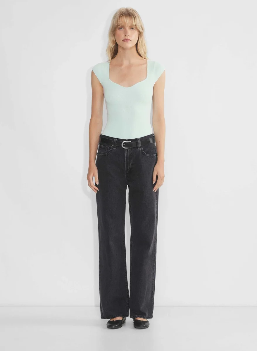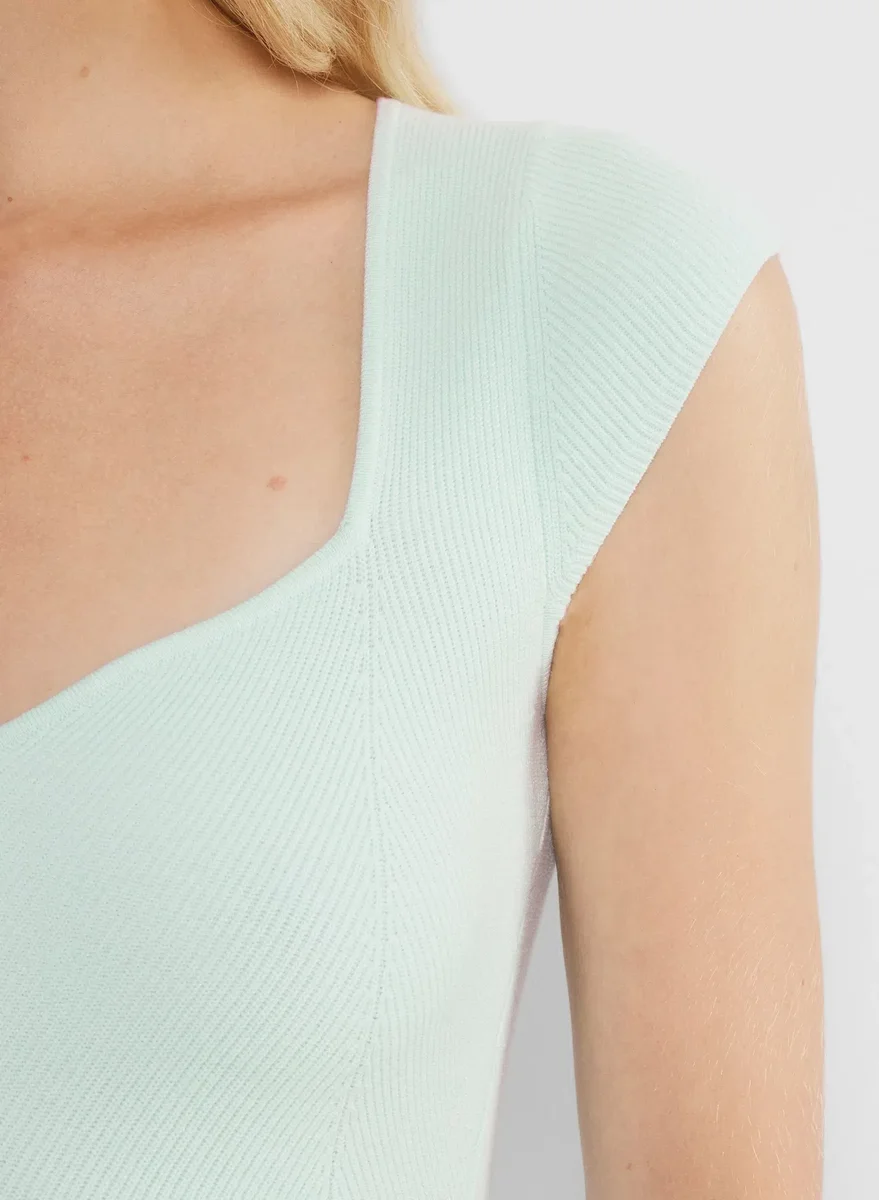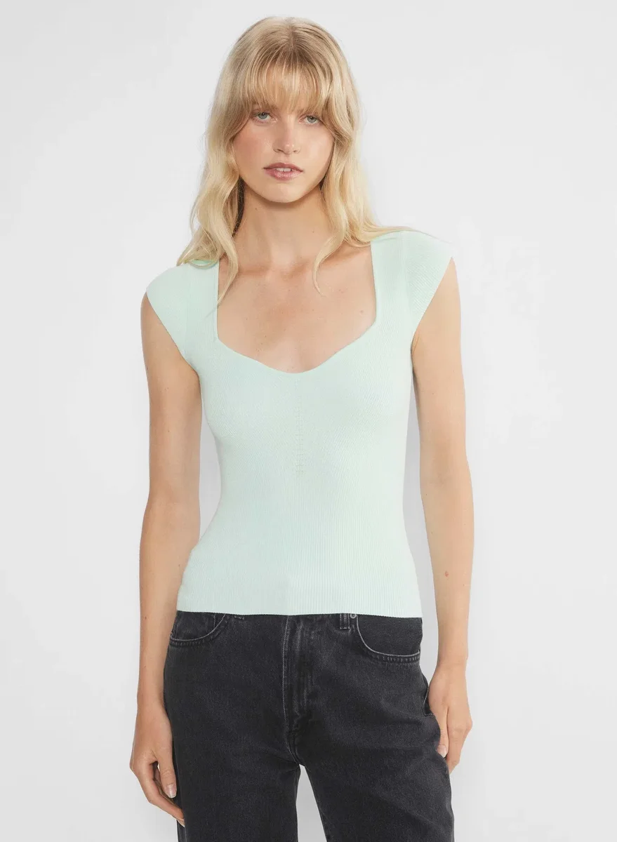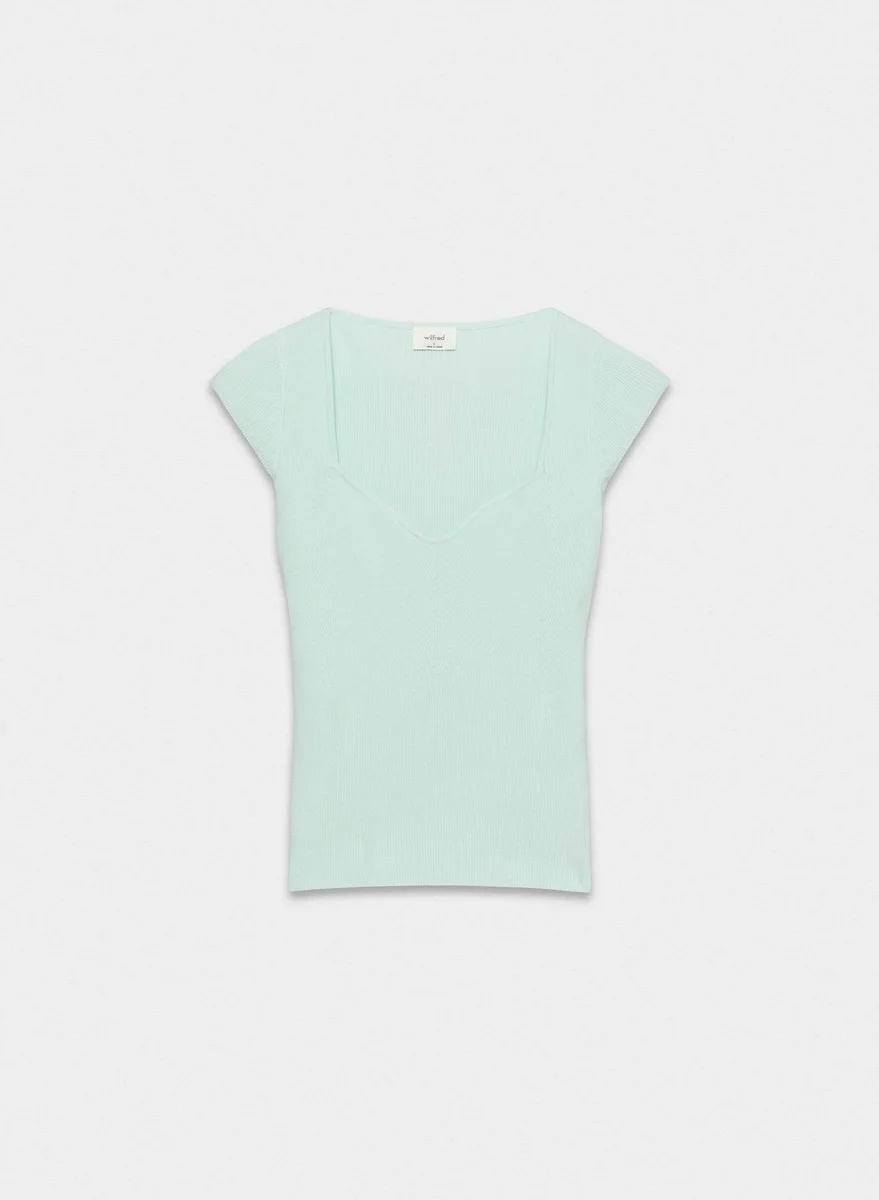 The shortsleeve iteration of a Wilfred darling, this is a fully fashioned sweater with a sweetheart neckline. It’s knit with Wonder Yarn — the lightweight yarn that lives up to its name. This peachy soft yarn is made with LENZING™ ECOVERO™ Viscose and offers the all-season warmth of wool, without the wool. This garment is constructed using a Half Cardigan stitch with vertical ribs for a textural look and feel.