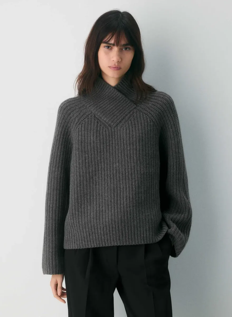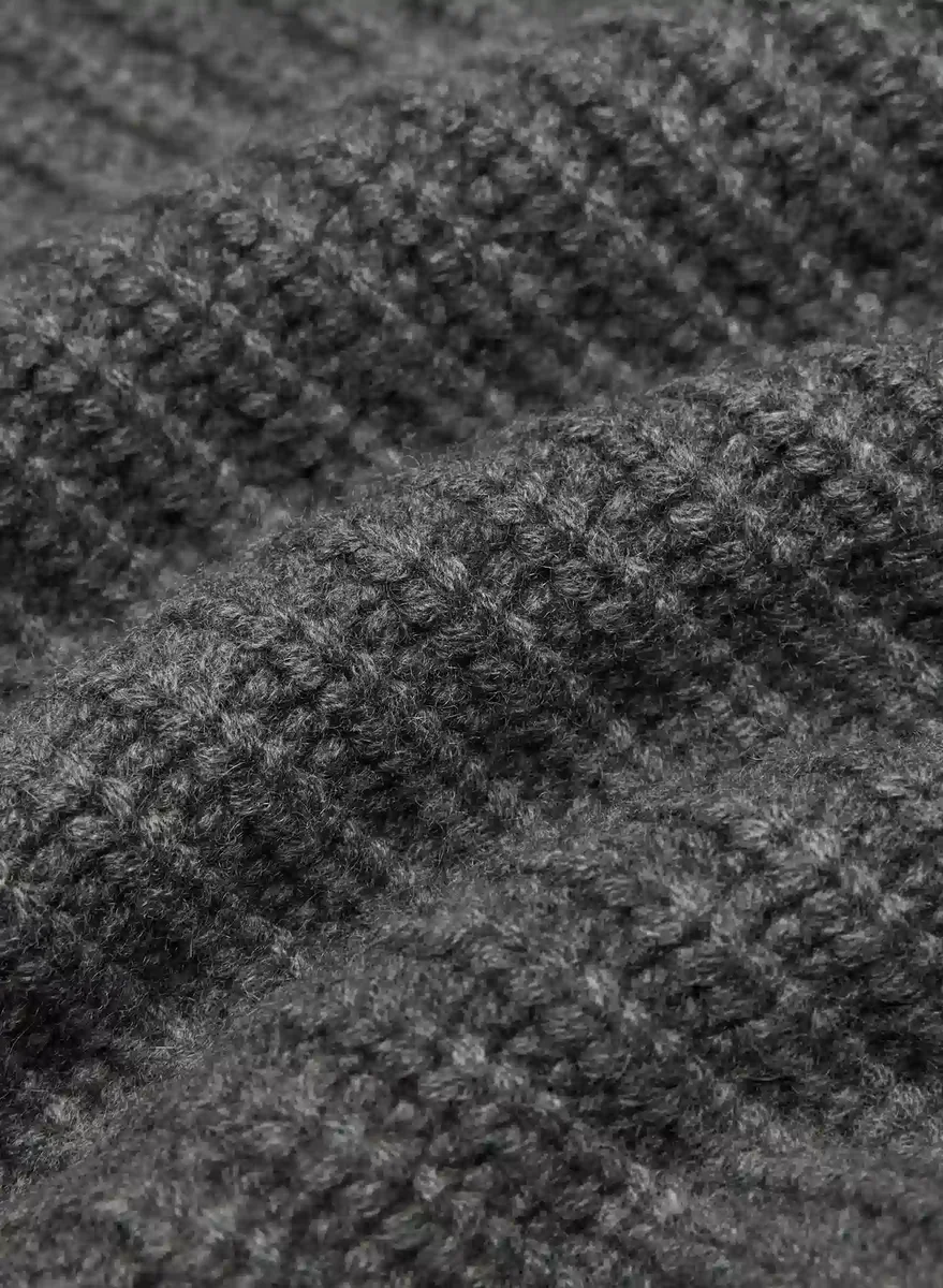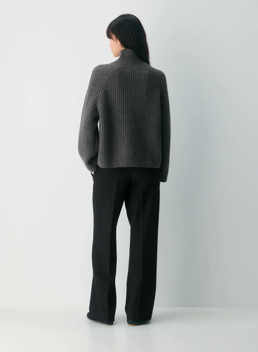 This is a turtleneck sweater with raglan sleeves and a relaxed fit. It’s knit from a lofty, spongey yarn that’s naturally warm and luxuriously soft. The yarn is made with cashmere verified to The Good Cashmere Standard® by AbTF and responsibly sourced wool. It’s constructed using a Half Cardigan stitch with vertical ribs for a textural look and feel.