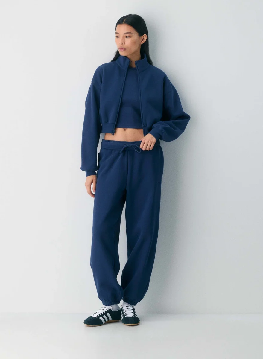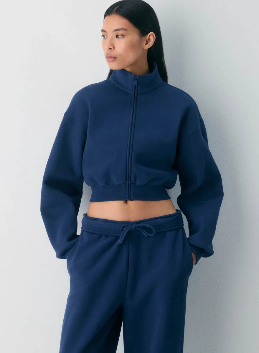 Honey, we shrunk the zip-upThis is a cropped mockneck zip-up with dropped shoulders and ribbed trim. It’s made with Aritzia’s Cozy Sweatfleece — premium