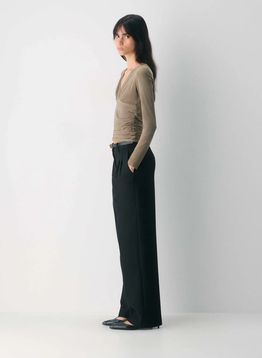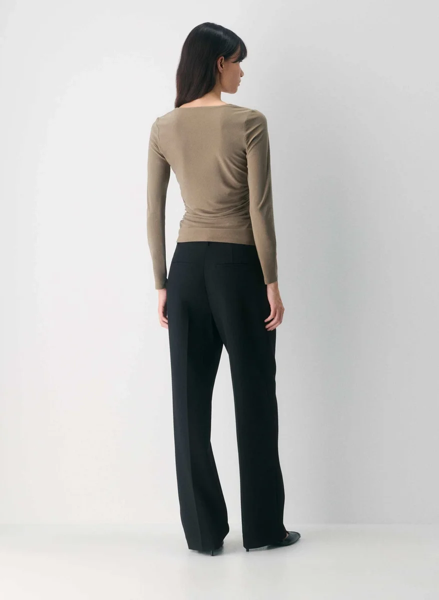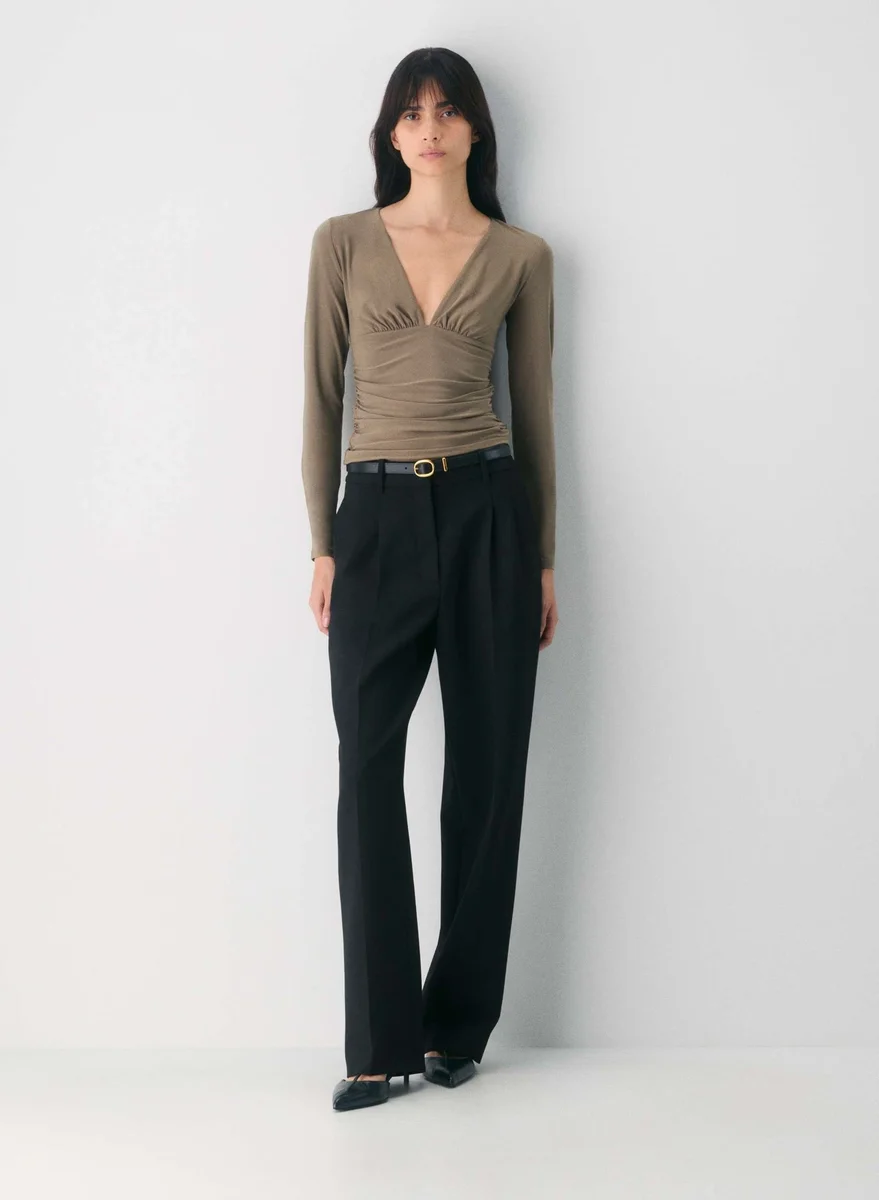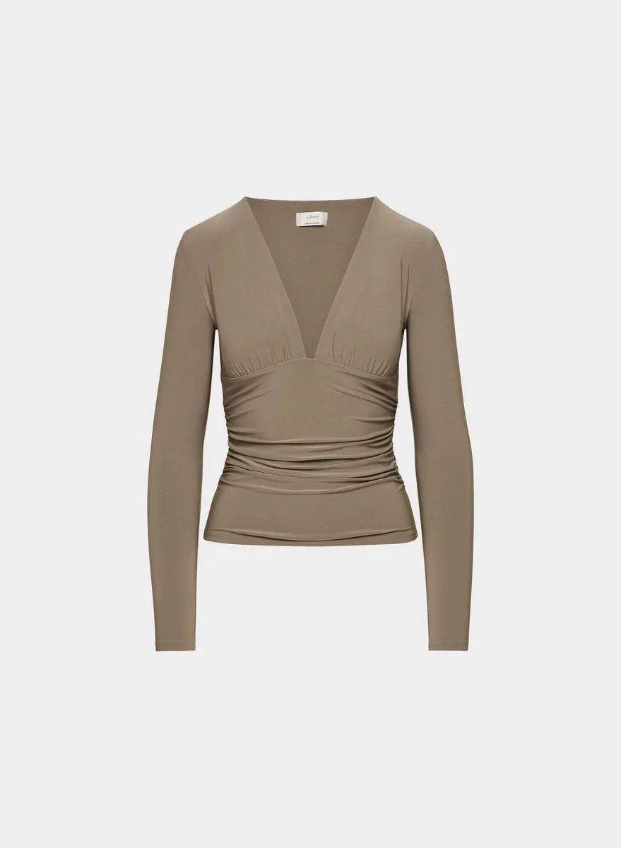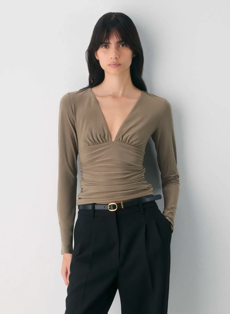 This is a V-neck longsleeve with ruched sides and a tight fit. It’s made with Smooth Matter™ — drapey stretch jersey with a luxe, sleek feel and soft sheen.