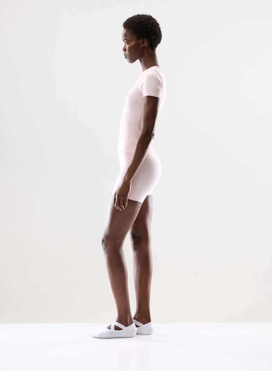 This is a crewneck t-shirt designed to fit tight. It’s made with BUTTER — barely there, buttery soft sweat-wicking fabric that shapes to your body for a second-skin feel.
