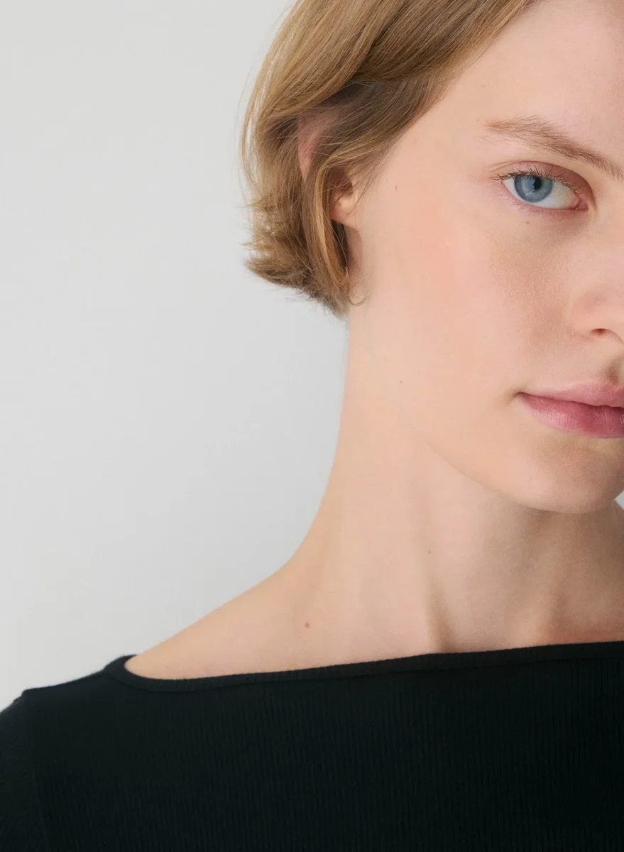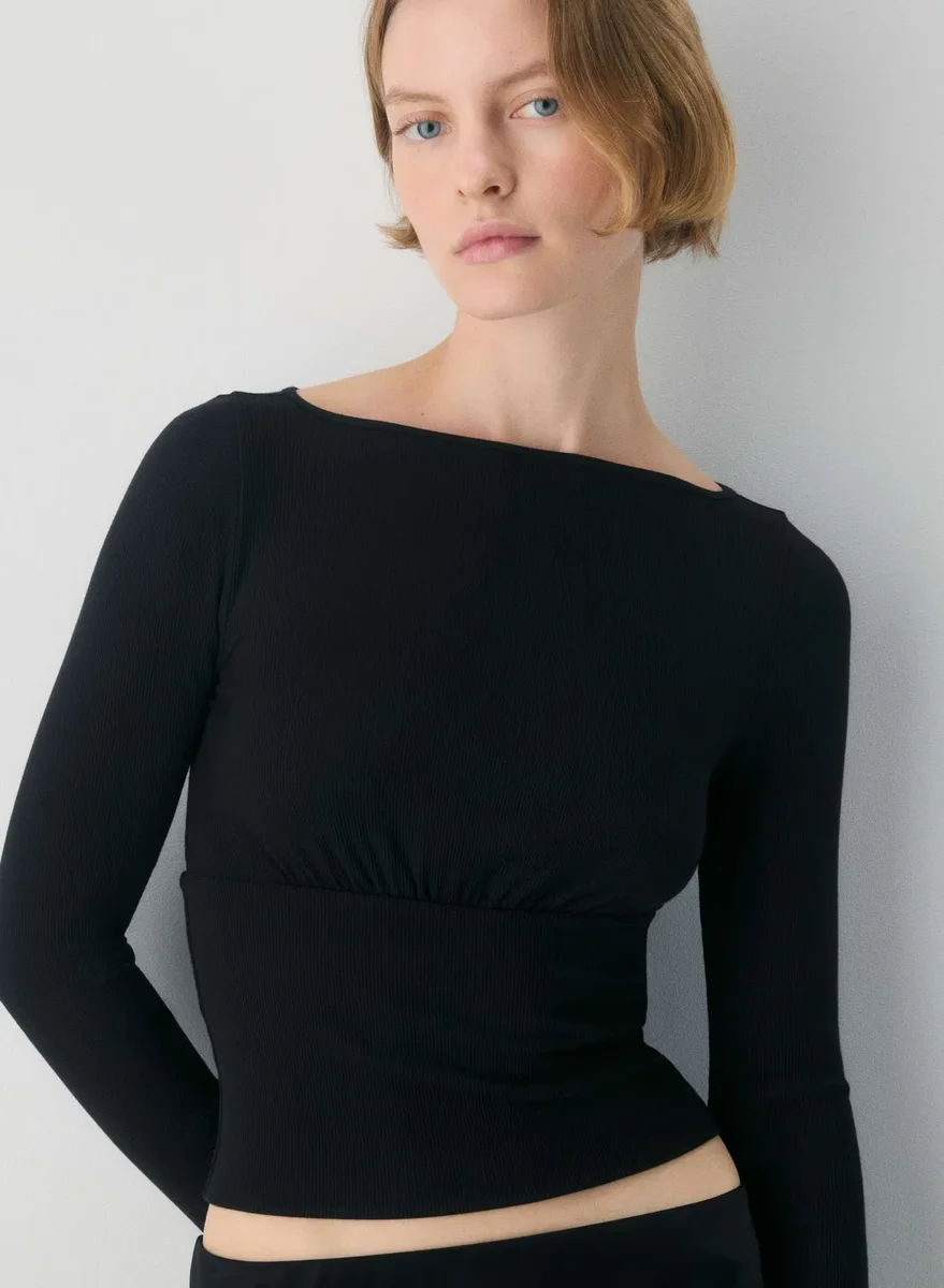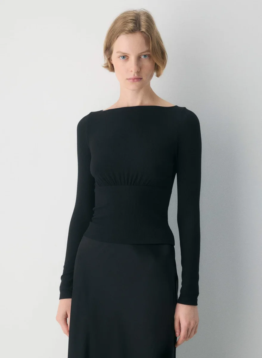 Corseted but comfyThis is a boatneck longsleeve with a fitted waist. It’s made from drapey ribbed fabric with a super-soft and cozy feel. The pinnacle of