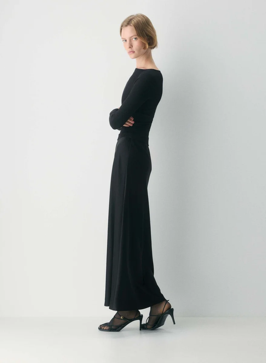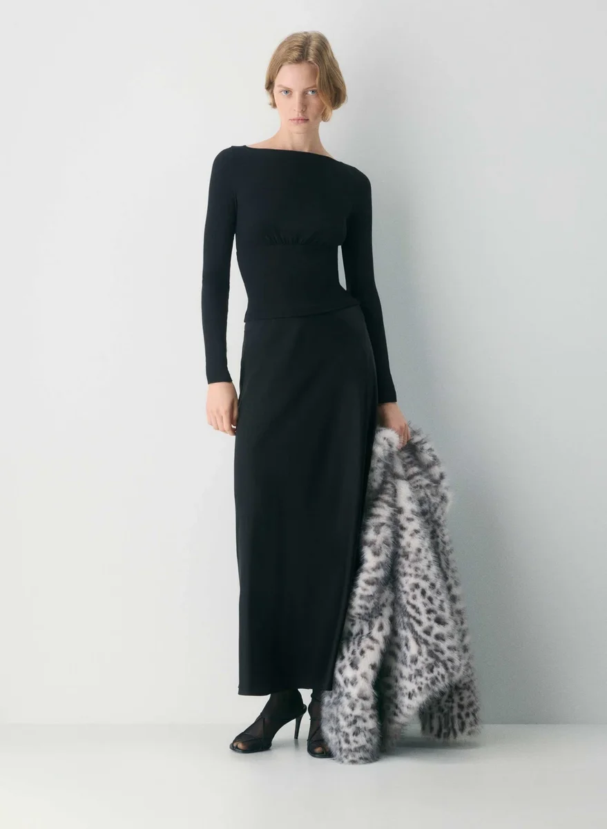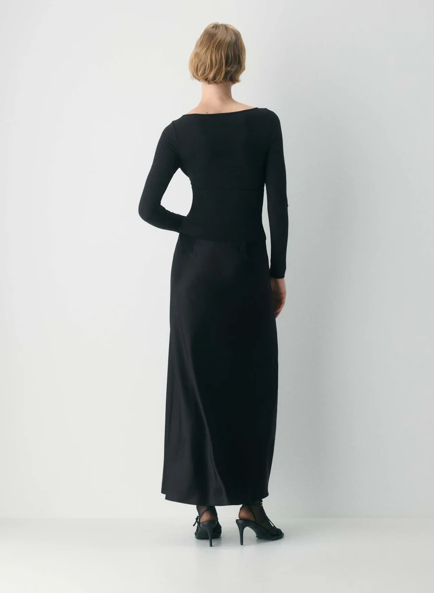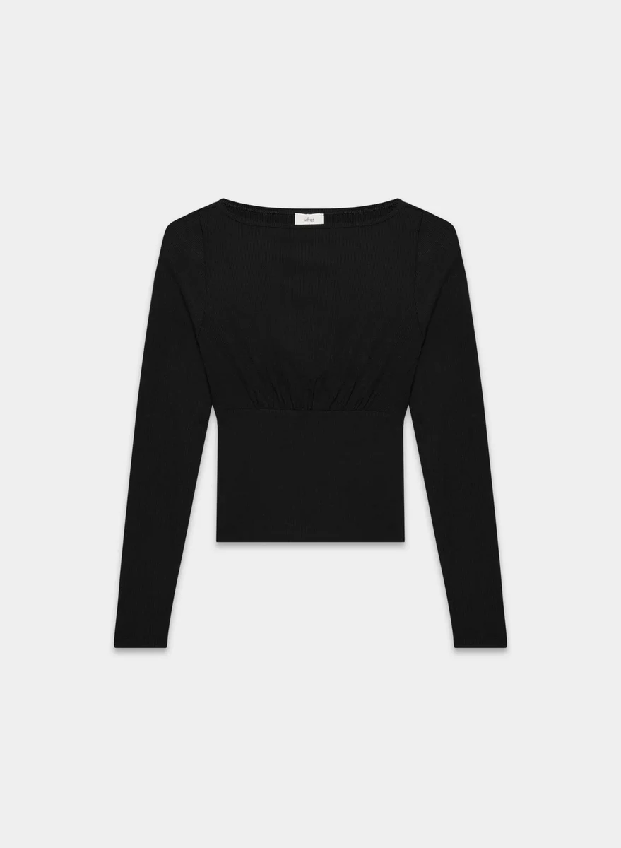 Corseted but comfyThis is a boatneck longsleeve with a fitted waist. It’s made from drapey ribbed fabric with a super-soft and cozy feel. The pinnacle of