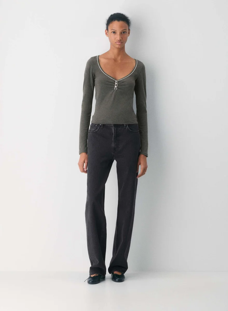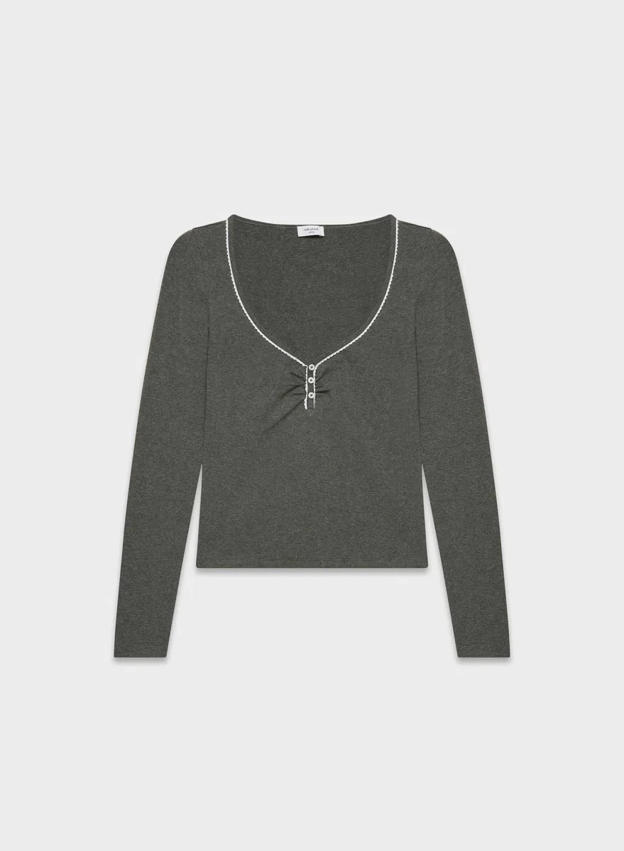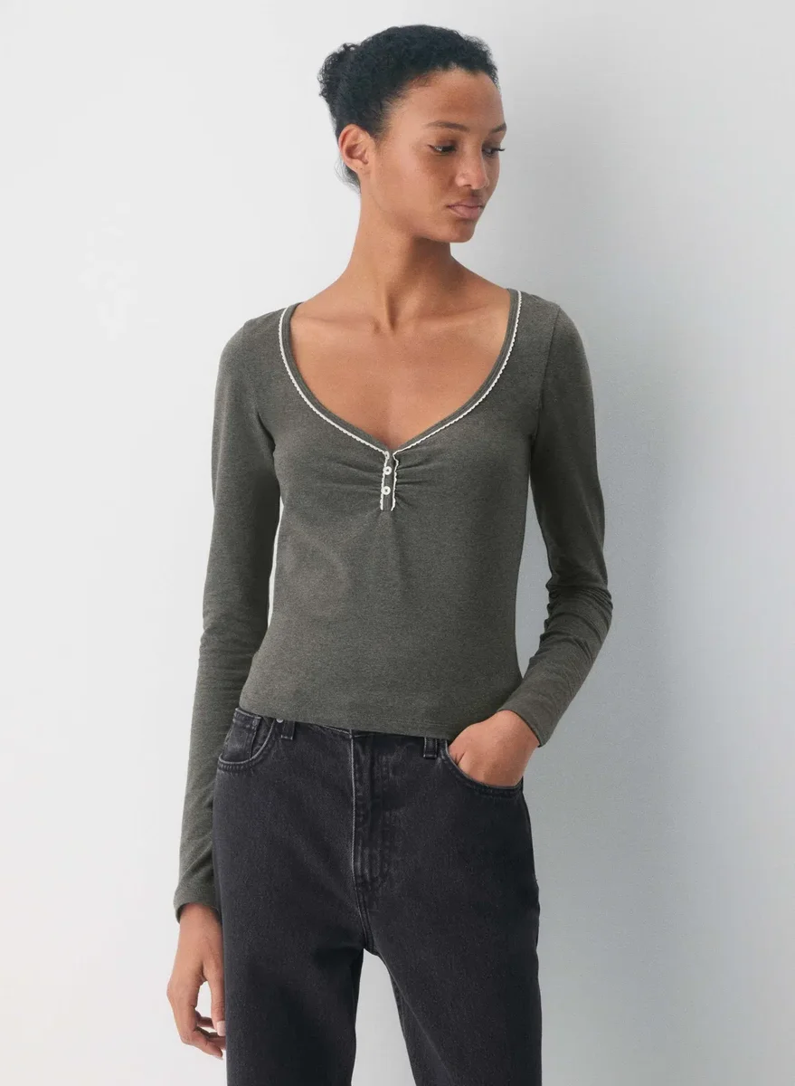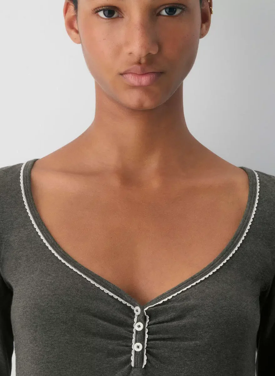 Aren’t you lovelyThis is a scoopneck henley longsleeve with a tight fit. It’s made with Chill — a cotton-soft, wear-everyday jersey that feels great against your skin. It’s been recently updated for an even gutsier feel.