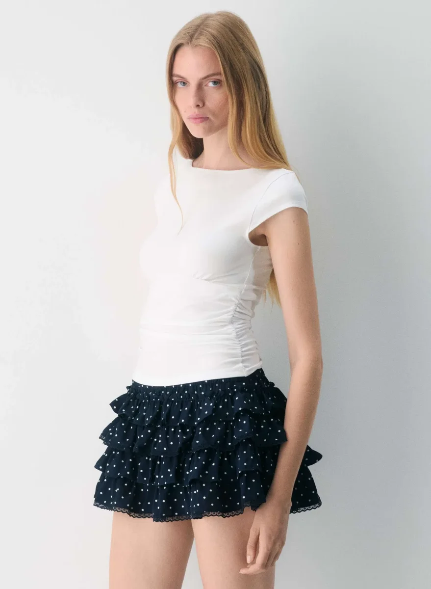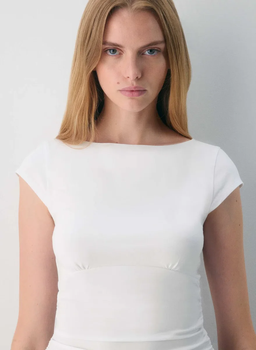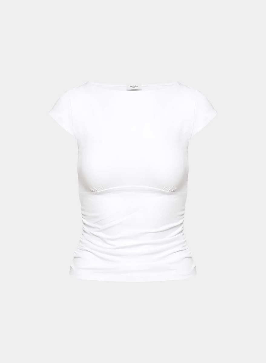 Ruche hourThis is a boatneck tee with side ruching and cap sleeves. It’s made with Chill — a cotton-soft, wear-everyday jersey that feels great against your skin. It’s been recently updated for an even gutsier feel.