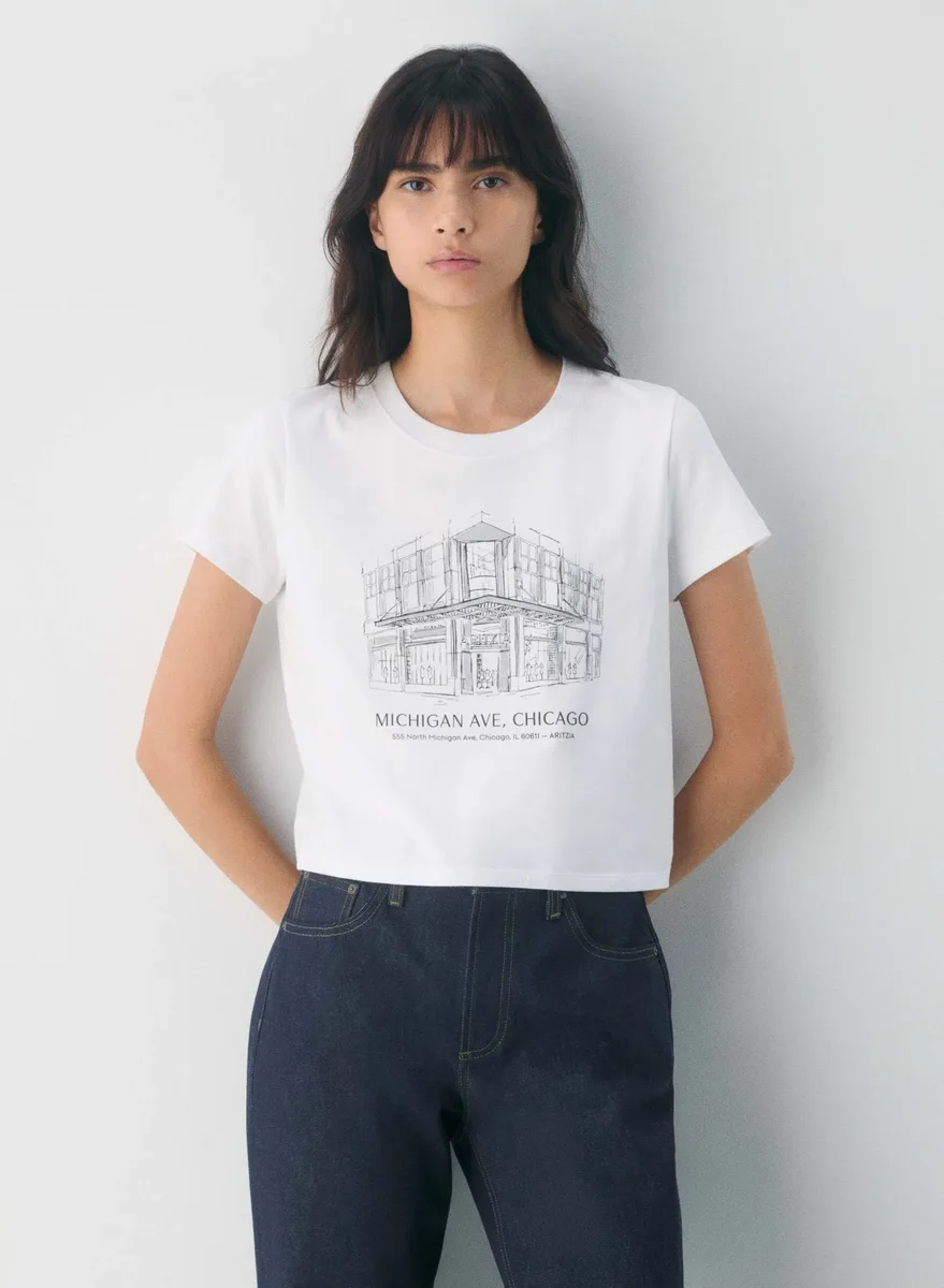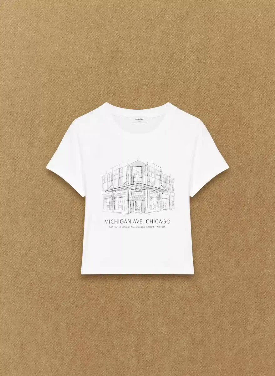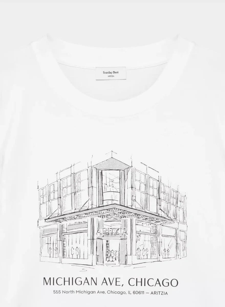 This is a crewneck tee with a classic fit. It’s made with CottonWhisk™ — soft 100% cotton jersey designed for 24/7 comfort. This version has an exclusive Aritzia Michigan Ave graphic.