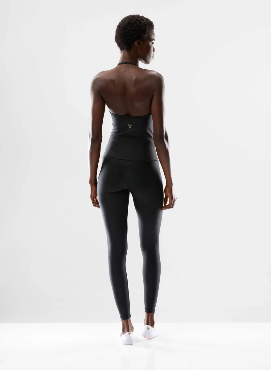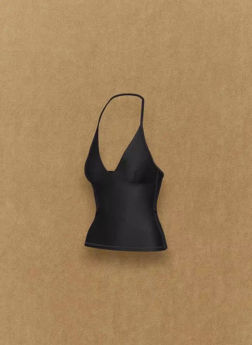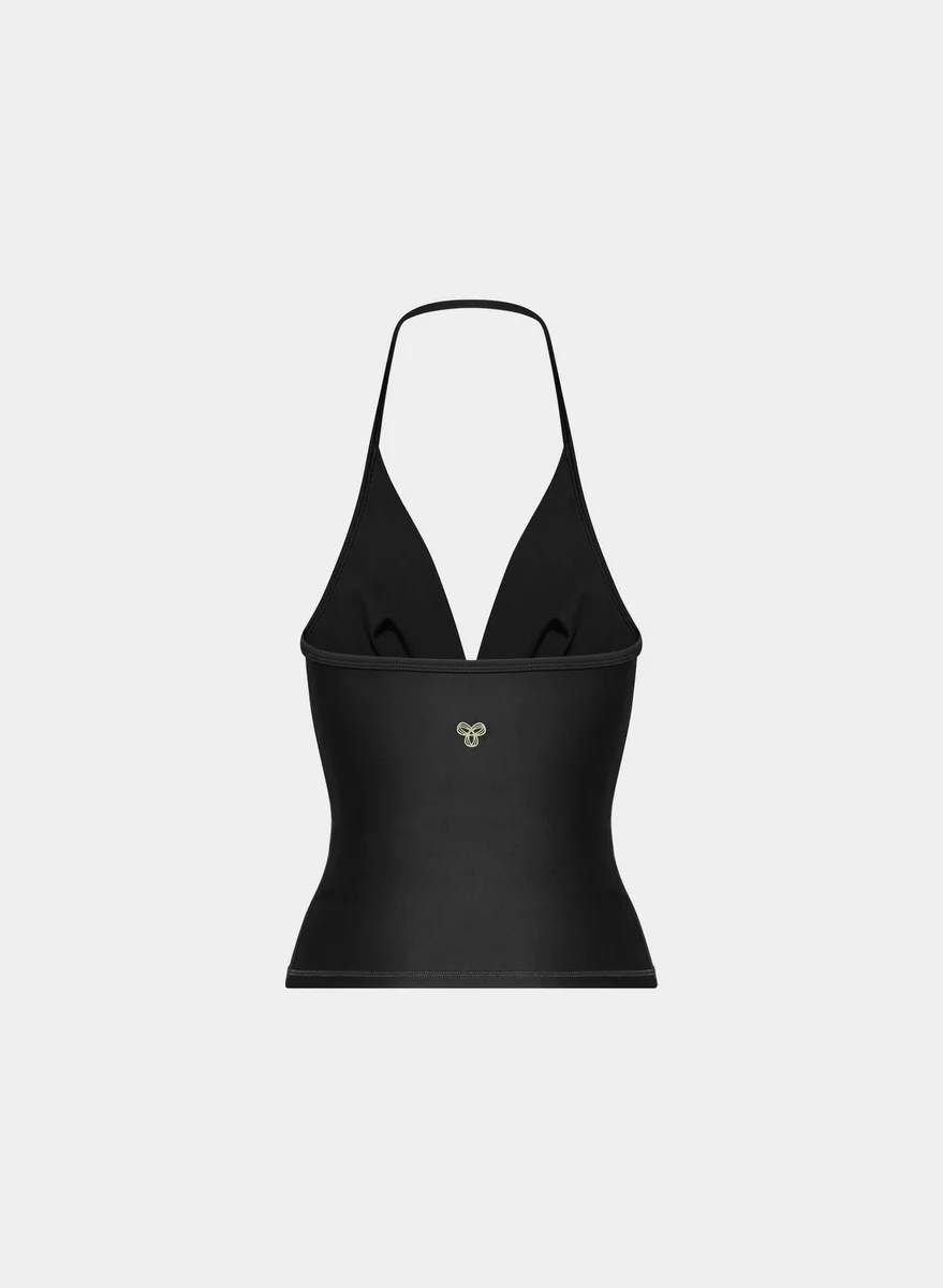 Doubles as workout motivationThis is a V-neck halter top. It’s cut from GloTone™ — sweat-wicking, sculpting fabric with a subtle sheen and sleek, body-hugging feel.