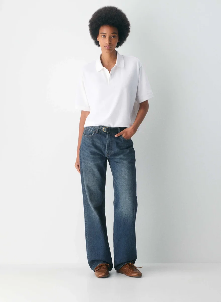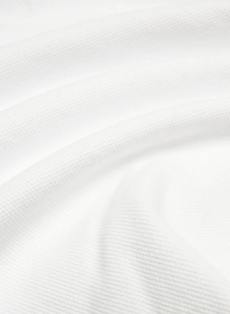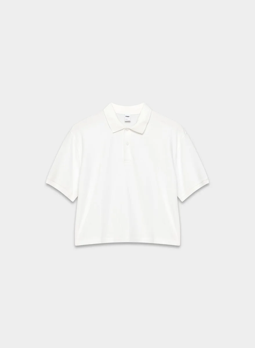 This is a shortsleeve polo with dropped shoulders and a relaxed fit. It’s made from comfy 100% cotton pique with a soft, slightly textural feel.