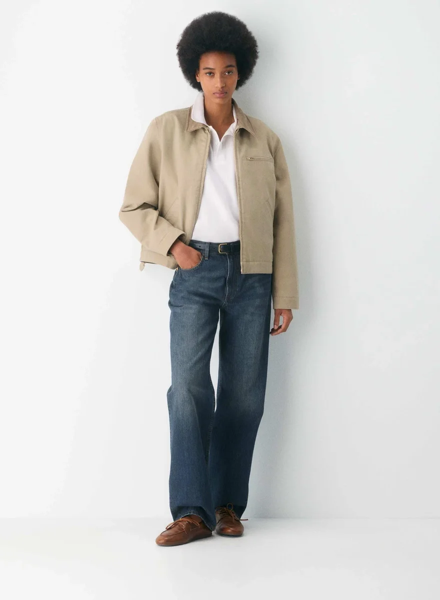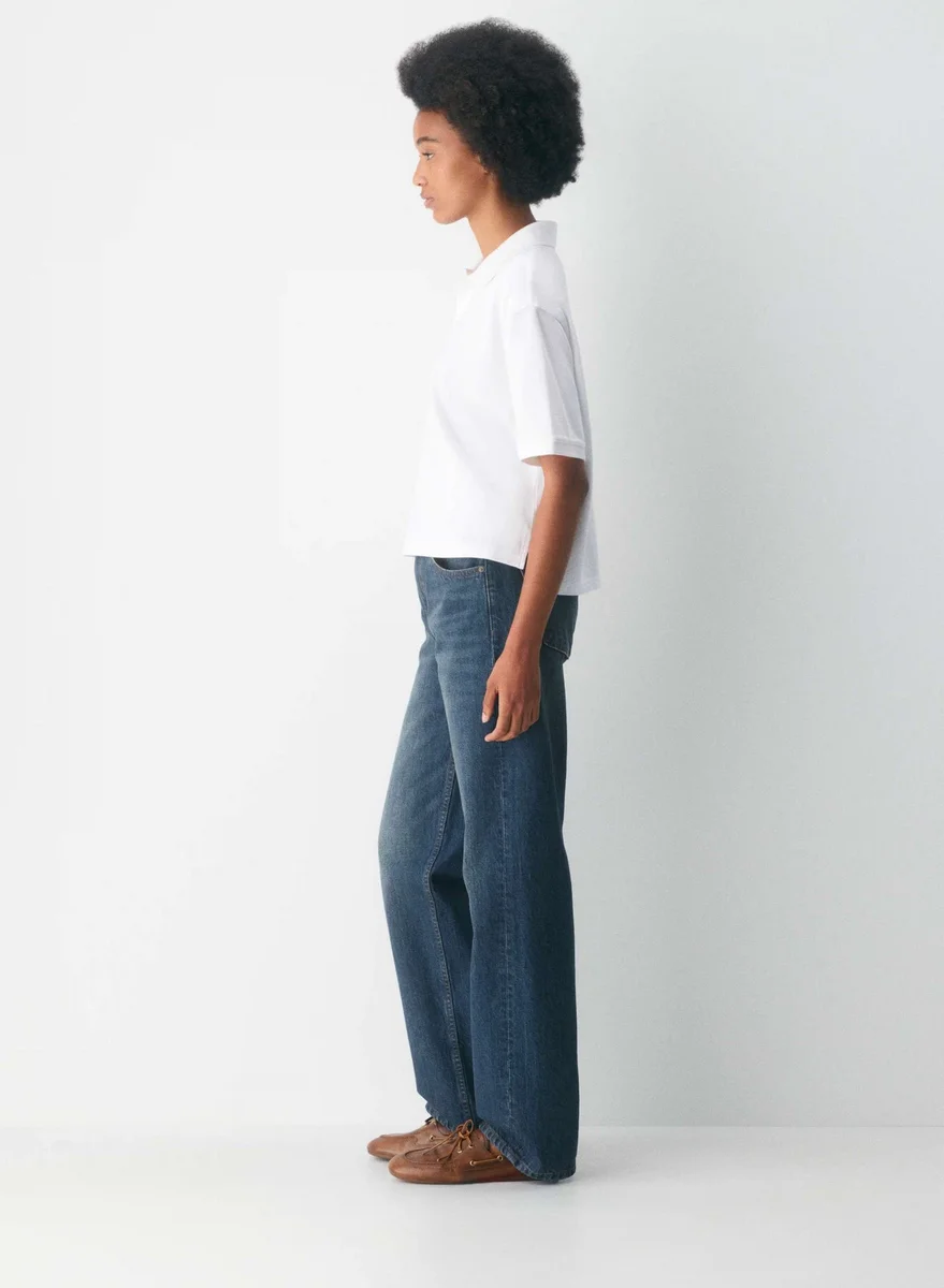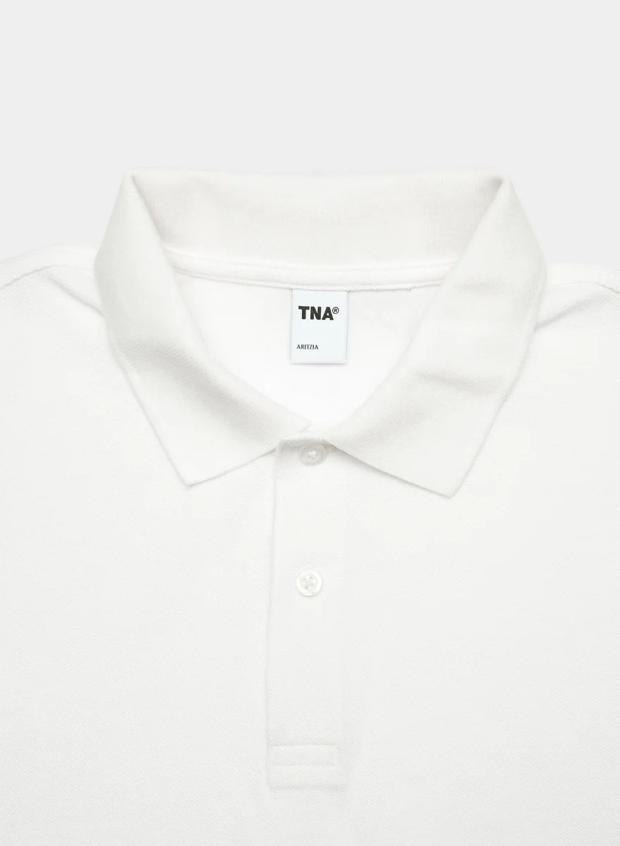 This is a shortsleeve polo with dropped shoulders and a relaxed fit. It’s made from comfy 100% cotton pique with a soft, slightly textural feel.