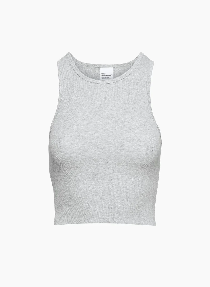 This is a cropped racerback tank with a high crew neckline and raw-edge hem. It’s made with HomeStretch™ — a body-hugging, stretchy ribbed fabric with a cottony soft feel. For your everyday.