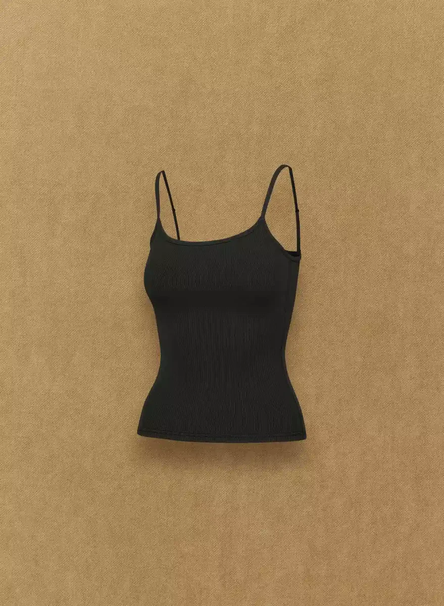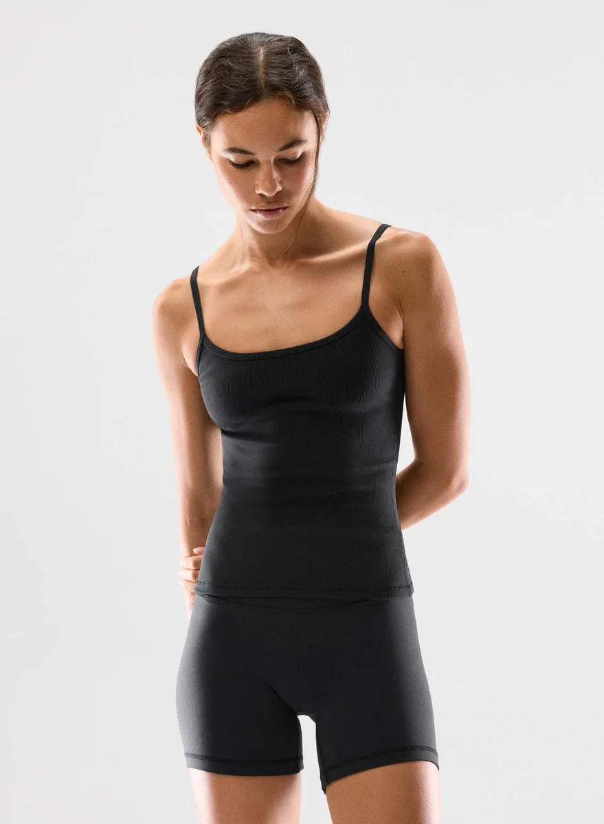 Nothing-not-to-like tankThis is a scoopneck cami with adjustable straps and a tight fit. It’s made with LIFE Rib— a versatile, body-hugging fabric that’s sweat wicking and cottony soft. This version has a ribbed texture.