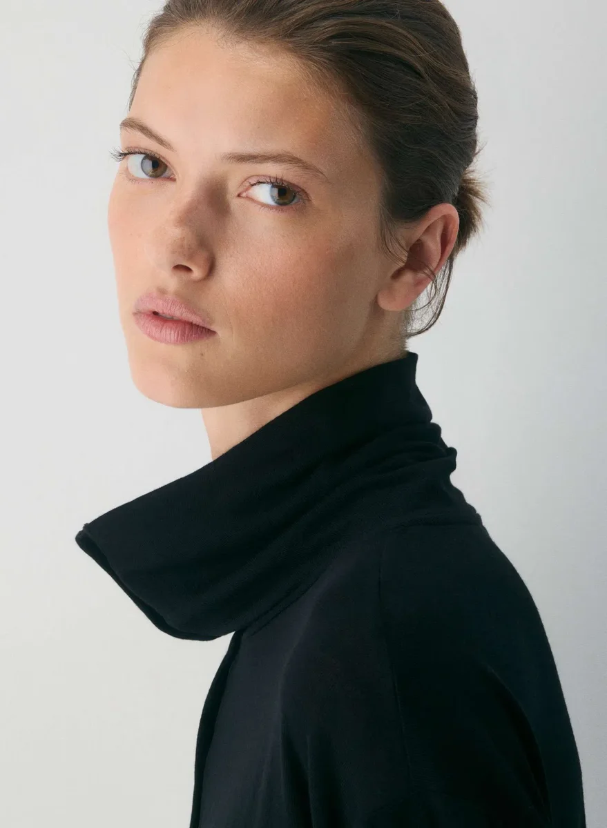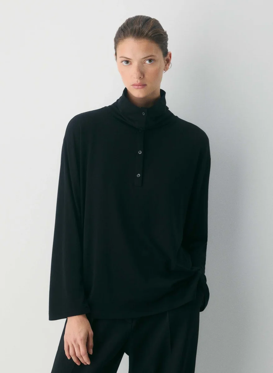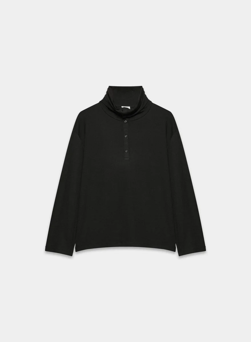 Defying categorization, this is a henley turtleneck button-up with a classic fit. It’s made with light, semi-sheer jersey with a soft feel. This fabric is made with 93% TENCEL™ Lyocell.