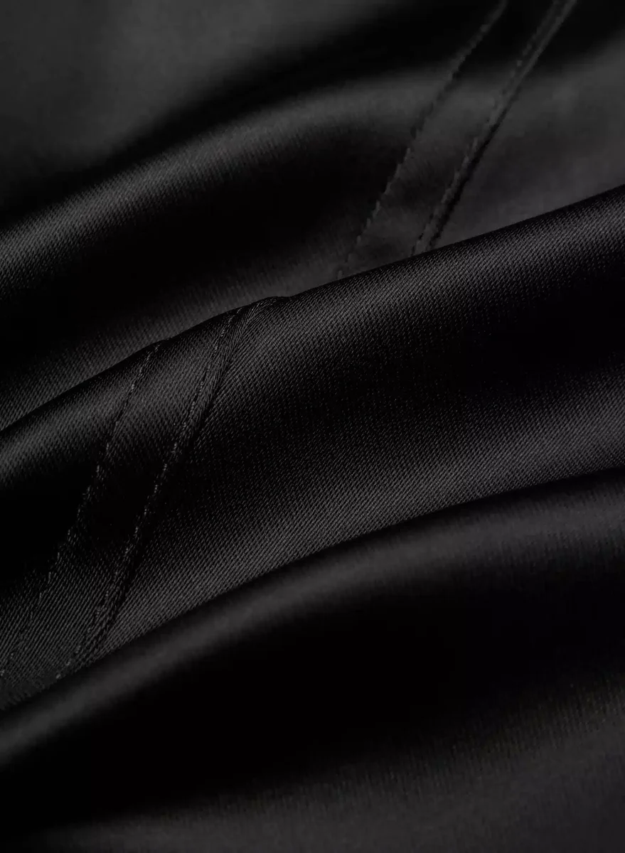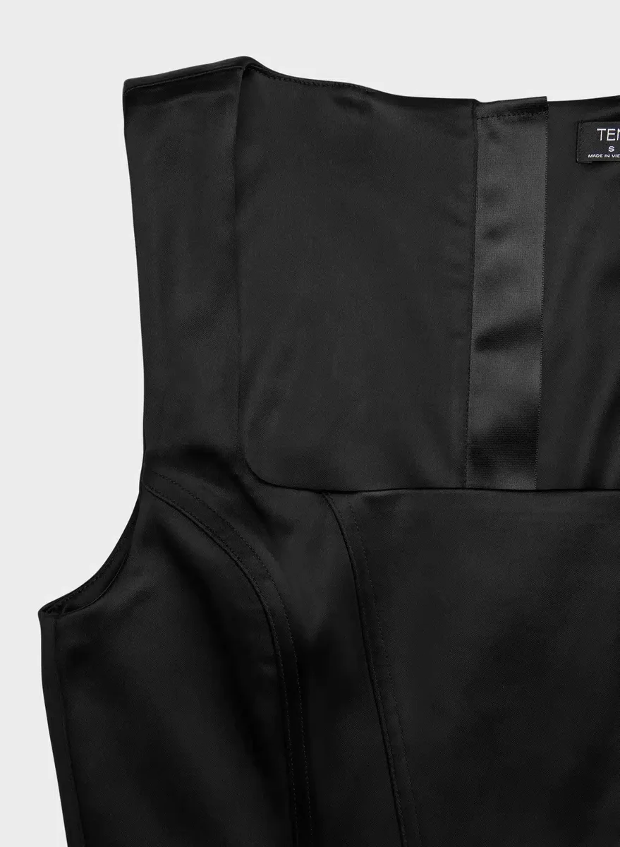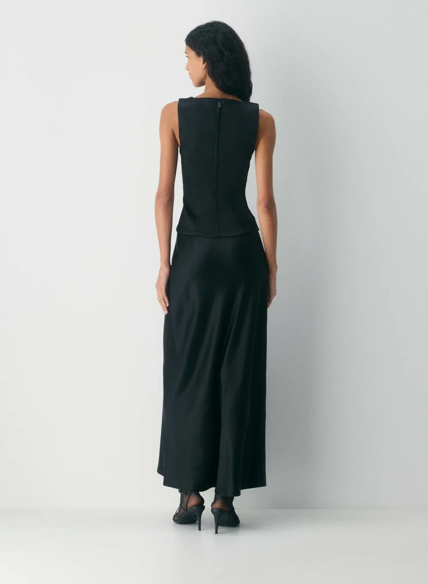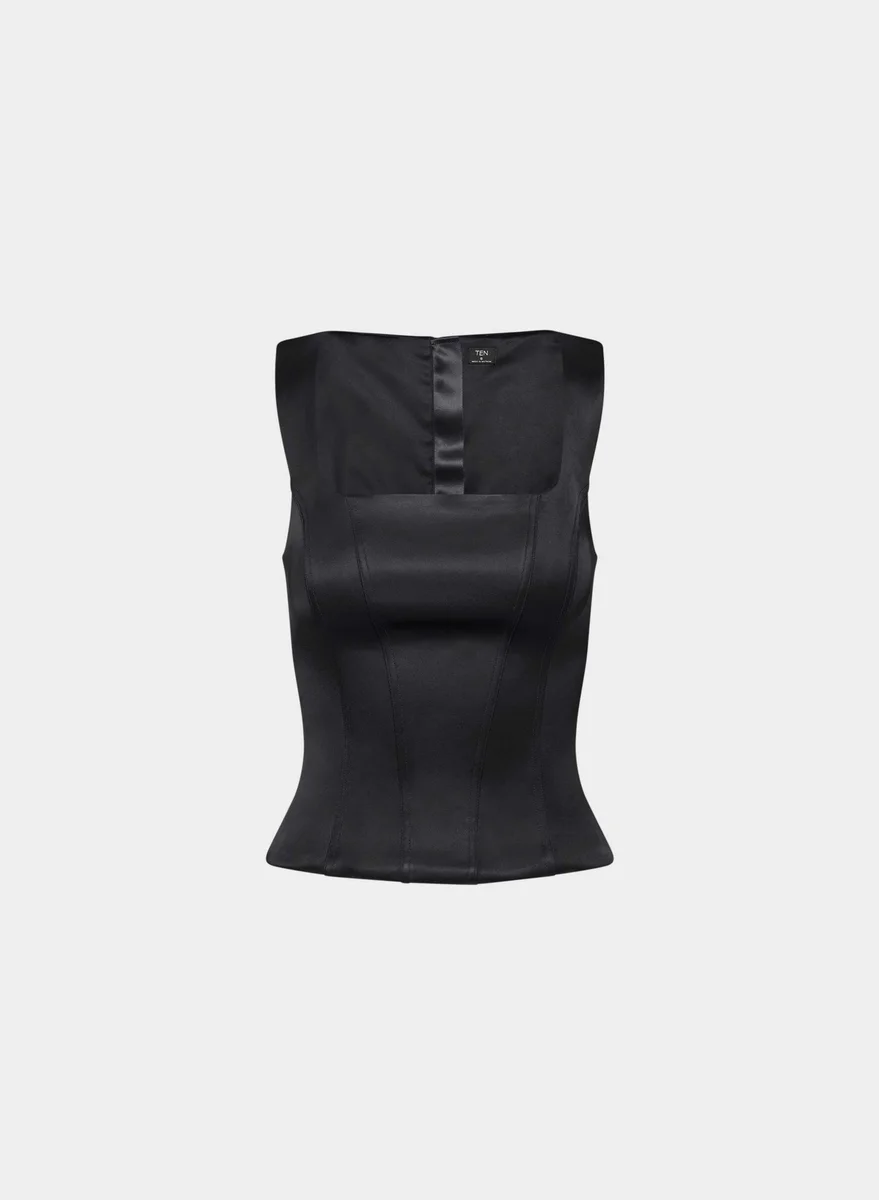 This is a bustier top with princess seams for shaping. It’s cut from sleek satin with a soft sheen and smooth feel. This fabric is made with 62% NAIA™ acetate.