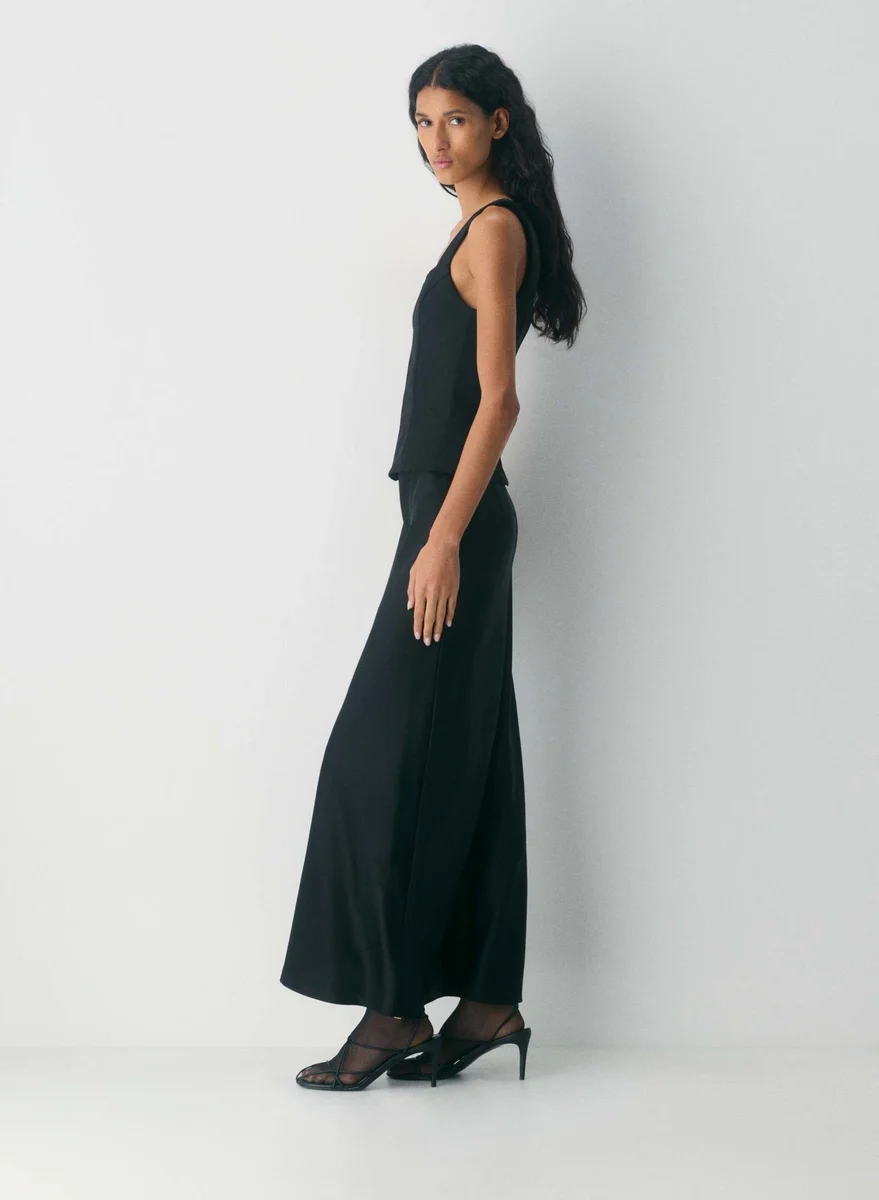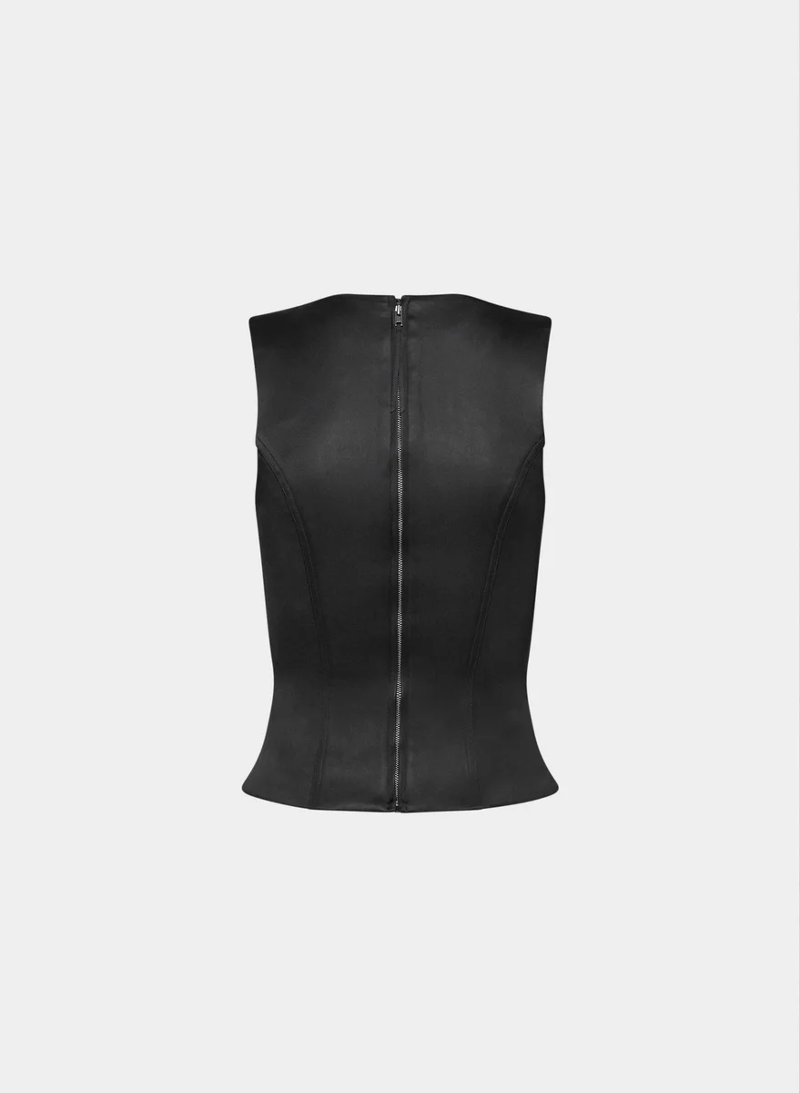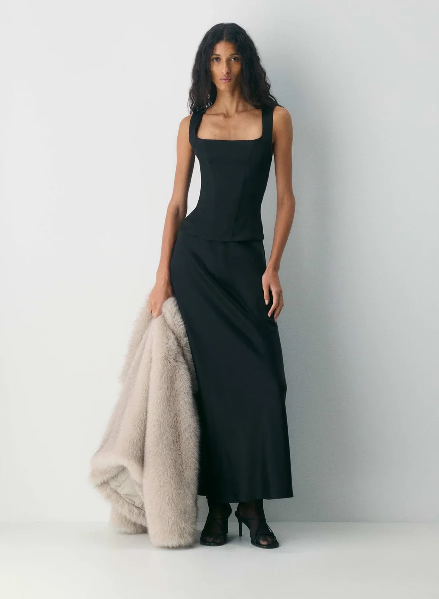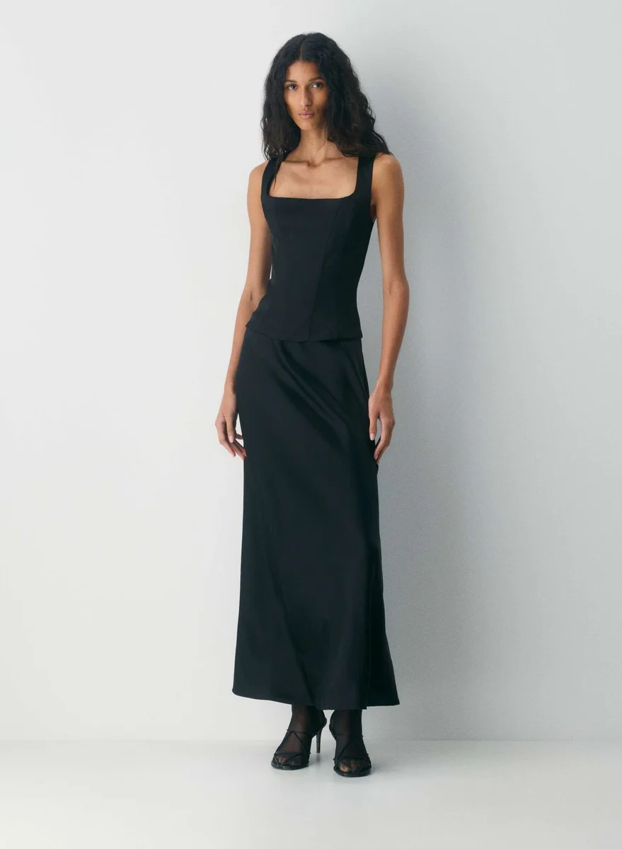 This is a bustier top with princess seams for shaping. It’s cut from sleek satin with a soft sheen and smooth feel. This fabric is made with 62% NAIA™ acetate.
